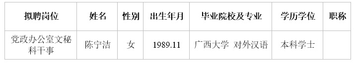 根據《關于印發< 廣西壯族自治區事業單位公開招聘人員實施辦法>的通知》(桂人社發[2011]155號)及《廣西銀行學校2018年冬季公開招聘非實名制人員公告》的有關規定,通過報名、資格審查、考試、考核、體檢等程序,經研究決定,擬聘陳寧潔同志為我校工作人員。現將擬聘用人員名單予以公示,公示時間為2019年2月9日-2019年2月19日,如有異議,請于2月19日下午5:00前以書面形式并署真實姓名反饋到學校紀委或組織人事處。聯系地址:廣西南寧市大學東路91號,郵政編碼:530007,聯系電話:0771—3240084,0771—3278961。