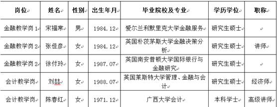 根據(jù)《關于印發(fā)< 廣西壯族自治區(qū)事業(yè)單位公開招聘人員實施辦法>的通知》(桂人社發(fā)[2011]155號)及《廣西金融職業(yè)技術學院2015年公開招聘工作人員方案》的有關規(guī)定。我院2015年第二次社會公開招聘工作嚴格遵照公開招聘程序,向社會發(fā)布招聘公告,經(jīng)考核、體檢等程序,確定宋福常等4名海外碩士研究生,陳春紅等1名副高級職稱人員為擬錄用人選。現(xiàn)擬對這5名同志進行公示,公示期為2015年12月8日至12月16日,具體情況如下: