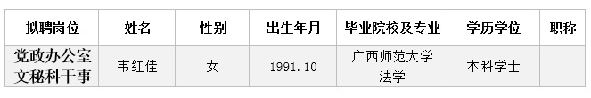 根據(jù)《關(guān)于印發(fā)<廣西壯族自治區(qū)事業(yè)單位公開招聘人員實(shí)施辦法>的通知》(桂人社發(fā)[2011]155號(hào))及《廣西銀行學(xué)校2018年冬季公開招聘非實(shí)名制人員公告》的有關(guān)規(guī)定,通過報(bào)名、資格審查、考試、考核、體檢等程序,經(jīng)研究決定,擬聘韋紅佳同志為我校工作人員。現(xiàn)將擬聘用人員名單予以公示,公示時(shí)間為2019年3月4日-2019年3月12日,如有異議,請于3月12日下午5:00前以書面形式并署真實(shí)姓名反饋到學(xué)校紀(jì)委或組織人事處。聯(lián)系地址:廣西南寧市大學(xué)東路91號(hào),郵政編碼:530007,聯(lián)系電話:0771—3240084,0771—3278961。