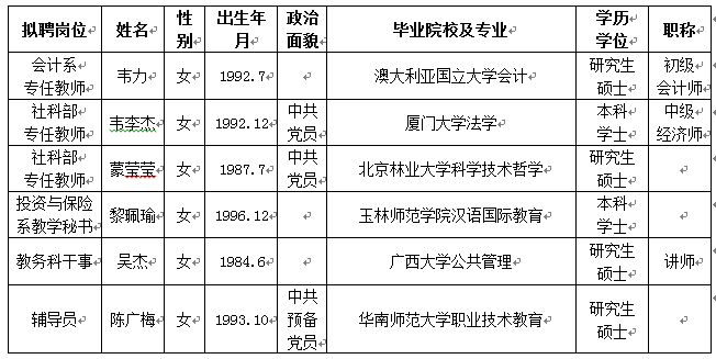 根據《關于印發<廣西壯族自治區事業單位公開招聘人員實施辦法>的通知》(桂人社發[2011]155號)及《廣西金融職業技術學院2020年第一批公開招聘非實名人員控制數工作人員公告》的有關規定,通過報名、資格審查、考試、考核、體檢等程序,經研究決定,擬聘韋力等6位同志為我院工作人員。現將擬聘用人員名單予以公示,公示時間為2020年9月25日-2020年10月10日,如有異議,請于10月10日下午5:00前以書面形式并署真實姓名反饋到學院紀委或組織人事處。聯系地址:廣西南寧市大學西路168號,郵政編碼:530007,聯系電話:0771—3481676,0771—3481779。