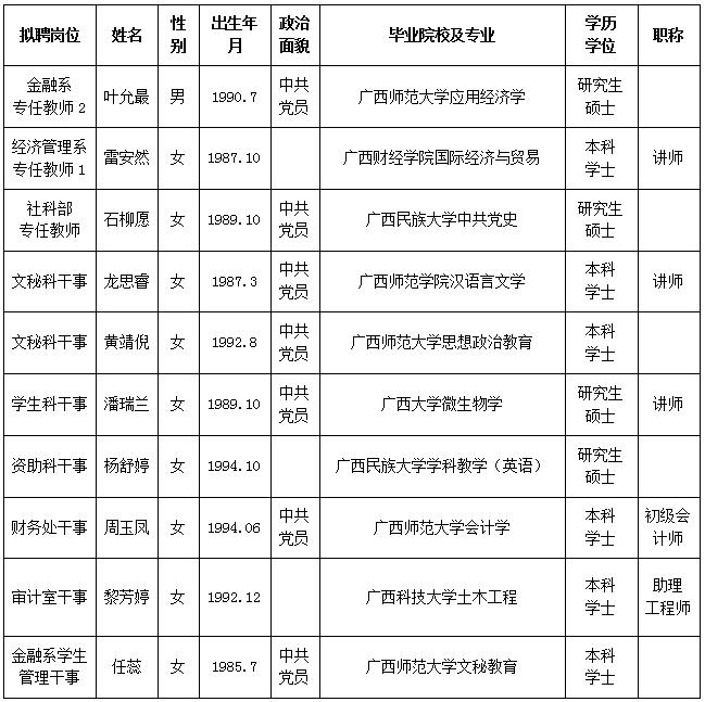 根據《關于印發<廣西壯族自治區事業單位公開招聘人員實施辦法>的通知》(桂人社發[2011]155號)及《廣西金融職業技術學院2020年第一批公開招聘非實名人員控制數工作人員公告》的有關規定,通過報名、資格審查、考試、考核、體檢等程序,經研究決定,擬聘葉允最等10位同志為我院工作人員。現將擬聘用人員名單予以公示,公示時間為2020年9月30日-2020年10月15日,如有異議,請于10月15日下午5:00前以書面形式并署真實姓名反饋到學院紀委或組織人事處。聯系地址:廣西南寧市大學西路168號,郵政編碼:530007,聯系電話:0771—3481676,0771—3481779。