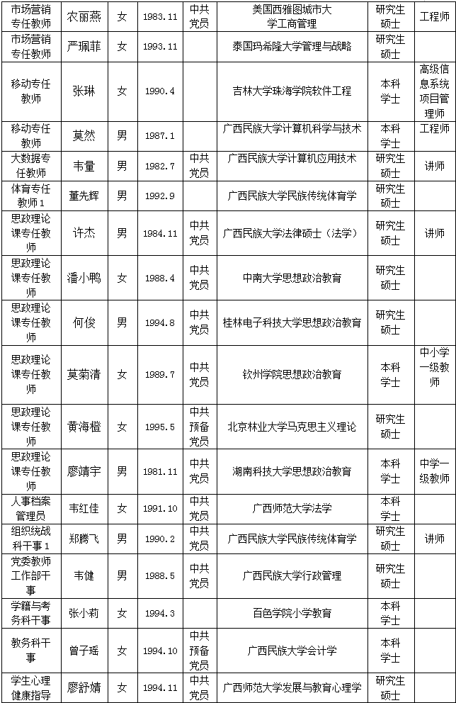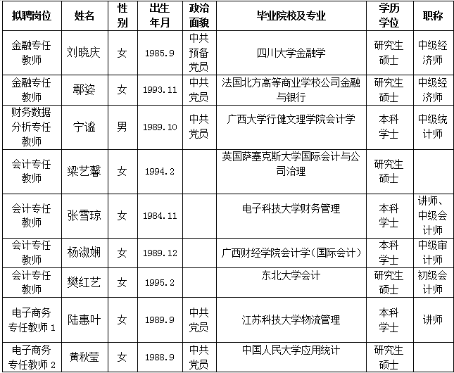 根據(jù)《關(guān)于印發(fā)<廣西壯族自治區(qū)事業(yè)單位公開招聘人員實施辦法>的通知》(桂人社發(fā)[2011]155號)及《廣西金融職業(yè)技術(shù)學院2021年第一批公開招聘非實名人員控制數(shù)工作人員公告》的有關(guān)規(guī)定,通過報名、資格審查、考試、考核、體檢等程序,經(jīng)研究決定,擬聘劉曉慶等42位同志為我院工作人員。現(xiàn)將擬聘用人員名單予以公示,公示時間為2021年11月30日-2021年12月8日,如有異議,請于12月8日下午5:00前以書面形式并署真實姓名反饋到學院紀委或組織人事處。聯(lián)系地址:廣西南寧市大學西路168號,郵政編碼:530007,聯(lián)系電話:0771—3481676,0771—3481779。