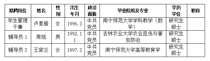 根據《關于印發<廣西壯族自治區事業單位公開招聘人員實施辦法>的通知》(桂人社發[2011]155號)及《廣西金融職業技術學院2022年第一批公開招聘非實名人員控制數工作人員公告》的有關規定,通過報名、資格審查、考試、考核、體檢等程序,經研究決定,擬聘盧星媛等3位同志為我院工作人員。現將擬聘用人員名單予以公示,公示時間為2022年9月2日-2022年9月8日,如有異議,請于9月8日下午5:00前以書面形式并署真實姓名反饋到學院紀委或組織人事處。聯系地址:廣西南寧市大學西路168號,郵政編碼:530007,聯系電話:0771—3481338,0771—3481779。