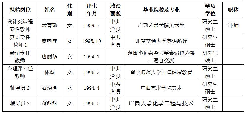 根據《關于印發<廣西壯族自治區事業單位公開招聘人員實施辦法>的通知》(桂人社發[2011]155號)及《廣西金融職業技術學院2022年第一批公開招聘非實名人員控制數工作人員公告》的有關規定,通過報名、資格審查、考試、考核、體檢等程序,經研究決定,擬聘孟菁璐等6位同志為我院工作人員?,F將擬聘用人員名單予以公示,公示時間為2022年9月6日-2022年9月12日,如有異議,請于9月12日下午5:00前以書面形式并署真實姓名反饋到學院紀委或組織人事處。聯系地址:廣西南寧市大學西路168號,郵政編碼:530007,聯系電話:0771—3481338,0771—3481779。