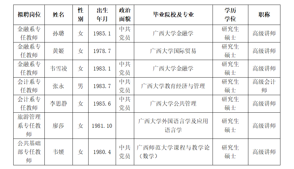 根據《關于印發<廣西壯族自治區事業單位公開招聘人員實施辦法>的通知》(桂人社發〔2011〕155號)及《廣西金融職業技術學院2022年秋季公開招聘高級職稱人才公告》的有關規定,通過報名、資格審查、考試、考核、體檢等程序,經研究決定,擬聘孫璐等7位同志為我院工作人員。現將擬聘用人員名單予以公示,公示時間為2023年1月20日-2023年1月26日,如有異議,請于1月26日下午5:00前以書面形式并署真實姓名反饋到學院紀委或組織人事處。聯系地址:廣西南寧市大學西路168號,郵政編碼:530007,聯系電話:0771—3481338,0771—3481779。