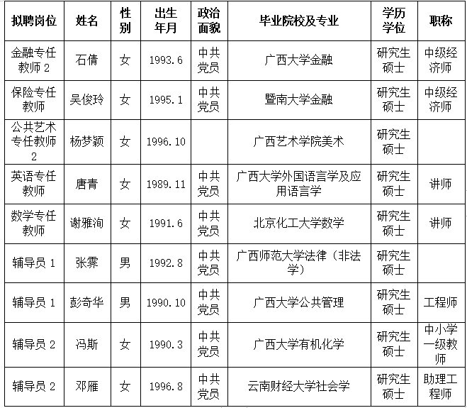 根據《關于印發<廣西壯族自治區事業單位公開招聘人員實施辦法>的通知》(桂人社發〔2011〕155號)及《廣西金融職業技術學院2023年第二批公開招聘非實名人員控制數工作人員公告》的有關規定,通過報名、資格審查、考試、考核、體檢等程序,經研究決定,擬聘石倩等9位同志為我院工作人員。現將擬聘用人員名單予以公示,公示時間為2024年1月8日-2024年1月14日,如有異議,請于2024年1月14日下午5:00前以書面形式并署真實姓名反饋到學院紀委或組織人事處。聯系地址:廣西南寧市大學西路168號,郵政編碼:530007,聯系電話:0771—3481338,0771—3481779。