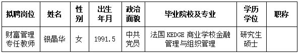 根據《關于印發<廣西壯族自治區事業單位公開招聘人員實施辦法>的通知》(桂人社發〔2011〕155號)及《廣西金融職業技術學院2023年第二批公開招聘非實名人員控制數工作人員公告》的有關規定,通過報名、資格審查、考試、考核、體檢等程序,經研究決定,擬聘銀晶華同志為我校工作人員。現將擬聘用人員名單予以公示,公示時間為2024年2月25日-2024年3月2日,如有異議,請于2024年3月2日下午5:00前以書面形式并署真實姓名反饋到學院紀委或組織人事處。聯系地址:廣西南寧市大學西路168號,郵政編碼:530007,聯系電話:0771—3481338,0771—3481779。