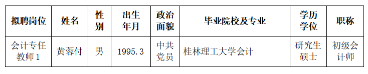 根據《關于印發<廣西壯族自治區事業單位公開招聘人員實施辦法>的通知》(桂人社發〔2011〕155號)及《廣西金融職業技術學院2023年第二批公開招聘非實名人員控制數工作人員公告》的有關規定,通過報名、資格審查、考試、考核、體檢等程序,經研究決定,擬聘黃蓉付同志為我校工作人員。現將擬聘用人員名單予以公示,公示時間為2024年3月21日-2024年3月27日,如有異議,請于2024年3月27日下午5:00前以書面形式并署真實姓名反饋到學院紀委或組織人事處。聯系地址:廣西南寧市大學西路168號,郵政編碼:530007,聯系電話:0771—3481338,0771—3481779。