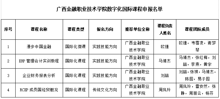 根據(jù)《自治區(qū)教育廳關(guān)于組織開展高等學(xué)校數(shù)字化國(guó)際課程征集活動(dòng)的通知》(桂教網(wǎng)信〔2024〕13號(hào))精神,學(xué)校擬推薦《漫步中國(guó)金融》等4門課程申報(bào)高等學(xué)校數(shù)字化國(guó)際課程,現(xiàn)將申報(bào)課程信息予以公示。