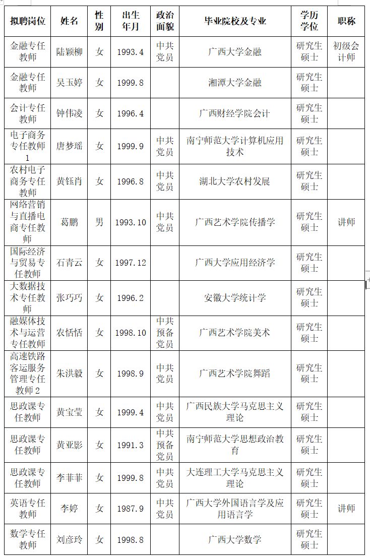 根據《關于印發<廣西壯族自治區事業單位公開招聘人員實施辦法>的通知》(桂人社發〔2011〕155號)及《廣西金融職業技術學院2024年第一批公開招聘非實名人員控制數工作人員公告》的有關規定,通過報名、資格審查、考試、考核、體檢等程序,經研究決定,擬聘陸穎柳等22位同志為我校工作人員。現將擬聘用人員名單予以公示,公示時間為2024年6月13日-2024年6月19日,如有異議,請于2024年6月19日下午5:00前以書面形式并署真實姓名反饋到學校紀委或人事處。聯系地址:廣西南寧市大學西路168號,郵政編碼:530007,聯系電話:0771—3481338,0771—3481779。