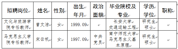 根據《廣西壯族自治區事業單位公開招聘人員實施辦法》(桂人社發〔2011〕155號)、《關于進一步規范區直事業單位公開招聘工作的通知》(桂人社辦發〔2013〕135號)、《關于進一步完善事業單位公開招聘工作的通知》(桂人社規〔2021〕7號)和《廣西壯族自治區2025年區直事業單位統一公開招聘工作人員公告》相關文件精神,通過公開招聘規定的程序,經研究決定,擬聘用曾文潔、宋云帆兩位同志。現將擬聘用人員的有關情況予以公示,公示期7天,公示時間為2025年9月1日—2025年9月7日,如有異議,請于2025年9月7日前以書面形式并署真實姓名反饋到我校紀委或人事處。聯系地址:廣西南寧市大學西路168號,郵政編碼:530007,聯系電話:0771—3481338,0771—3481779。