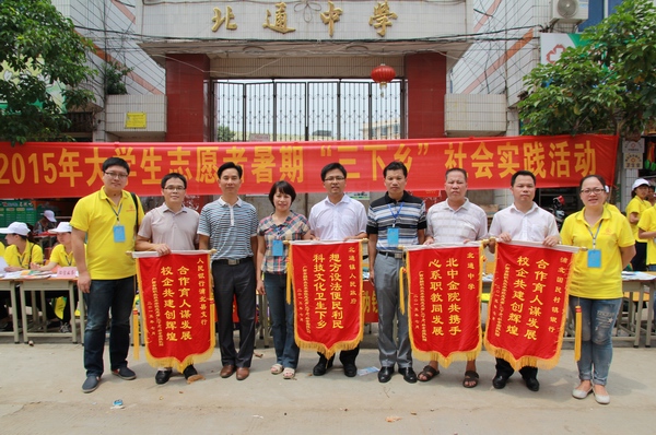 隨后,覃書記代表學院分別給北通中學、北通鎮(zhèn)人民政府、浦北國民村鎮(zhèn)銀行、人民銀行浦北縣支行贈送了錦旗,并對他們的大力支持和幫助表示衷心的感謝。尤其希望通過開展科技、文化、衛(wèi)生下鄉(xiāng)這個平臺,雙方達成更深層次的合作,共促職教事業(yè)的發(fā)展。