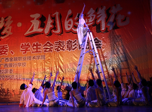 伴隨著莊嚴(yán)雄壯的《光榮啊,中國共青團(tuán)》合唱,晚會進(jìn)入了文藝演出環(huán)節(jié)。激情的演唱、優(yōu)美的舞蹈、感人的朗誦、獨(dú)特的禮儀展示、動聽的薩克斯獨(dú)奏贏得了觀眾的陣陣掌聲。大專部學(xué)生帶來的舞蹈節(jié)目《攀》,以精湛的演繹水平、獨(dú)特的表演形式及震撼人心的舞臺效果淋漓盡致地表達(dá)了青年追求夢想、超越自我、相愛互助的精神,將整場晚會推向了高潮。