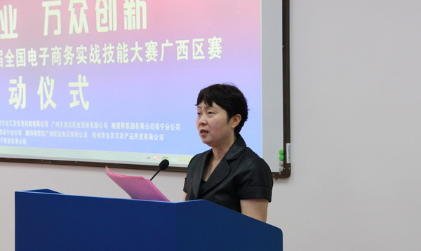 沈立君院長首先致歡迎詞,她說,本次大賽作為選拔創(chuàng)業(yè)創(chuàng)新職業(yè)技能人才的重要平臺,對提高職業(yè)教育的質(zhì)量,深化職業(yè)教育教學改革,促進校企合作,具有重要意義。是同學們鍛煉自己實踐能力,創(chuàng)新能力,提高團隊協(xié)作能力的極好機會,本次大賽的舉辦必將極大激發(fā)廣大職業(yè)教育學子學習的熱情,也必將對促進職業(yè)教育可持續(xù)發(fā)展,加快創(chuàng)新技術(shù)技能人才,推動電子商務在廣西經(jīng)濟發(fā)展的應用起到積極推動作用。我校承辦此次大賽,將在大賽主委會的統(tǒng)一領(lǐng)導下,高質(zhì)量、高水平的做好各項服務工作,并以此為契機,積極學習兄弟院校好的經(jīng)驗,參賽選手好的技能和方法,推動我校邁向新臺階。同時衷心祝愿同學們能取得優(yōu)異成績。