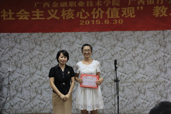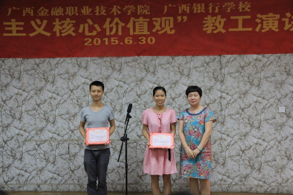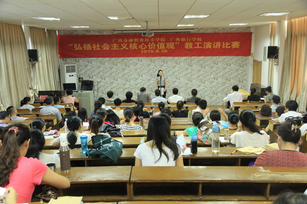 為更好地貫徹落實黨的十八大和十八屆三中、四中全會精神,迎接中國共產黨建黨94周年和豐富校園文化生活,廣西金融職業(yè)技術學院(廣西銀行校),于6月30日下午在電教一樓多媒體教室組織舉辦了一場“弘揚社會主義核心價值觀”教工演講比賽。