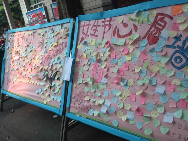 此次活動包含“心愿墻”和“我美麗,我自拍”兩項內容,新穎、簡單、有趣的活動形式吸引了眾多同學的踴躍參與。4月2日和4月3日,在“心愿墻”活動當天,學生會干部為女生們免費發放了精美的心愿卡。女生們將自己的心愿寫到心愿卡上,并將心愿卡貼在展板上進行展示。短短時間內,展板就被各式各樣的心愿卡所覆蓋。愛護關心女生的男生們也紛紛來到活動現場,了解女生們的心愿,為她們送上鼓勵和祝福。在“我美麗,我自拍”活動中,女生們的參與熱情空前高漲,她們用手機或相機進行自拍,踴躍參與自拍照的評選活動,詮釋自身的美麗、自信和魅力。評委從女生們上交的上百張自拍照中精心挑選出8張,放置到我校微信公眾號上,讓同學們進行投票,最終評選出三張最美自拍照并進行獎勵。