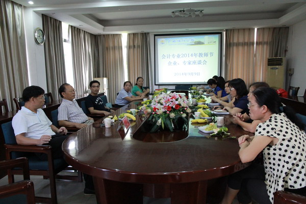 9月9日下午,為慶祝第三十個教師節,作為慶典活動之一的“會計專業教師與行業專家座談會”在我校五樓會議室隆重舉行。此次應邀出席本次座談會的行業專家分別有:廣西南寧市農業銀行辦公室主任韋業宏;廣西金匯財務管理公司總經理黃正璋;廣西中智財會服務公司總經理黃雋梅;廣西南寧馳騁電子科技有限公司經理劉俊峰;廣西南寧市農村信用合作社上堯分行副主任郭蓓。會議由會計系張紅梅老師主持。