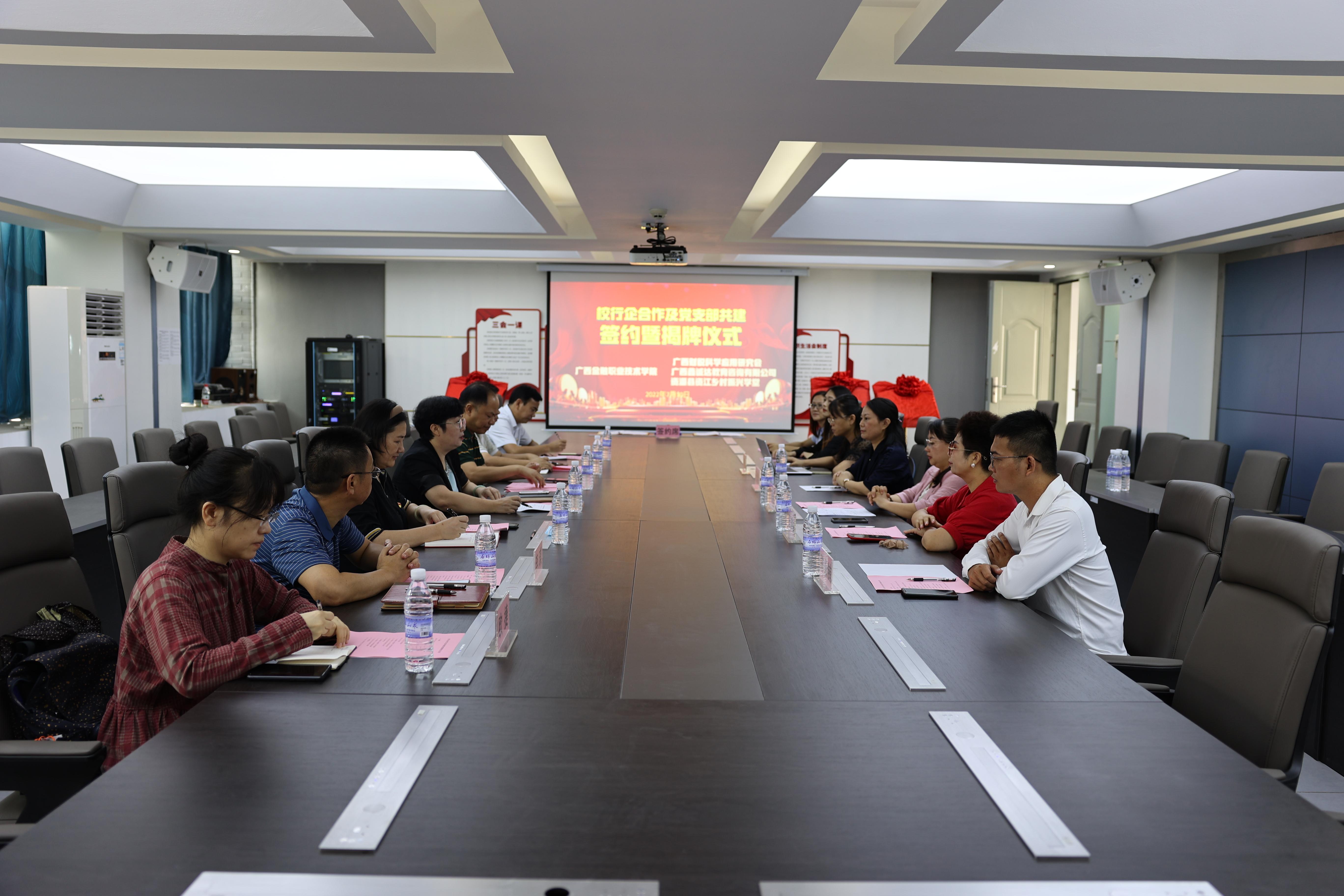 2022年7月30日,我校與廣西財稅科學應用研究會校行企合作及支部共建簽約暨揭牌儀式在西校區行政辦公樓512會議室舉行。我校黨委書記沈立君、副校長謝沛善以及廣西鑫誠達財稅咨詢集團有限責任公司董事長、廣西財稅科學應用研究會副會長、資源縣資江鄉村振興學堂理事長莫海玲等出席了儀式。儀式由副校長謝沛善主持。