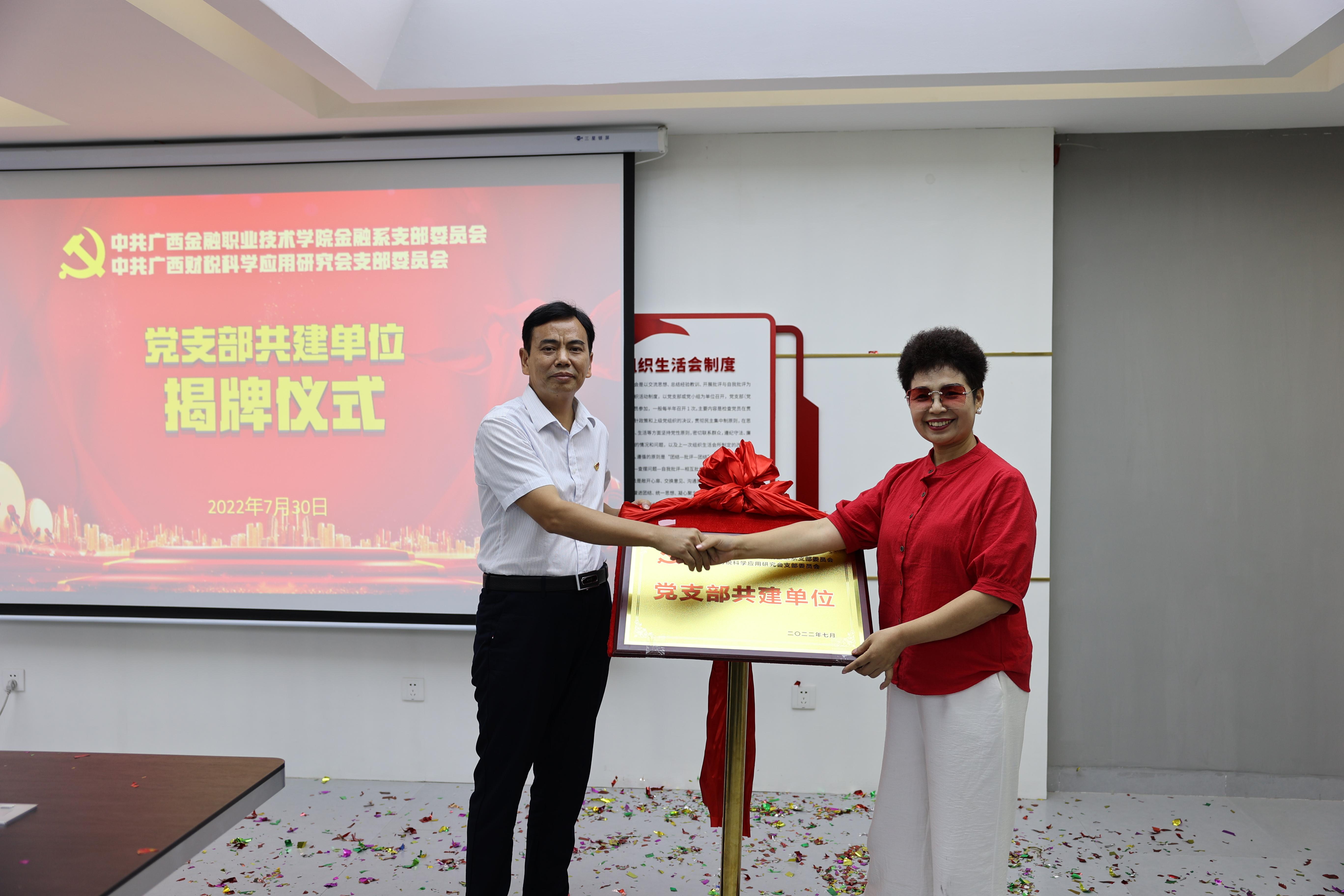黨委書記沈立君首先代表學校致辭,向莫海玲董事長一行表示熱烈歡迎,對廣西財稅科學應用研究會關心支持學校發展表示衷心感謝,向與會人員介紹了廣西金融職業技術學院及金融系發展情況。沈書記表示,此次校行企合作及支部共建合作,是深化校行企合作的又一大事、喜事、好事,是校企雙方發揮各自優勢、精準服務行業發展、推動產業轉型升級的積極探索,是深化產教融合、校企合作的有力實踐,更是學校積極落實《國家職業教育改革實施方案》中“將黨建工作與學校事業發展同部署、同落實、同考評”的要求,是落實產教融合校企“雙元”育人的堅實而有力的重要舉措。希望校企雙方在探索產業學院建設管理新機制、深化人才培養模式改革、提升服務產業發展能力、合作打造黨建工作新品牌等方面取得新突破。