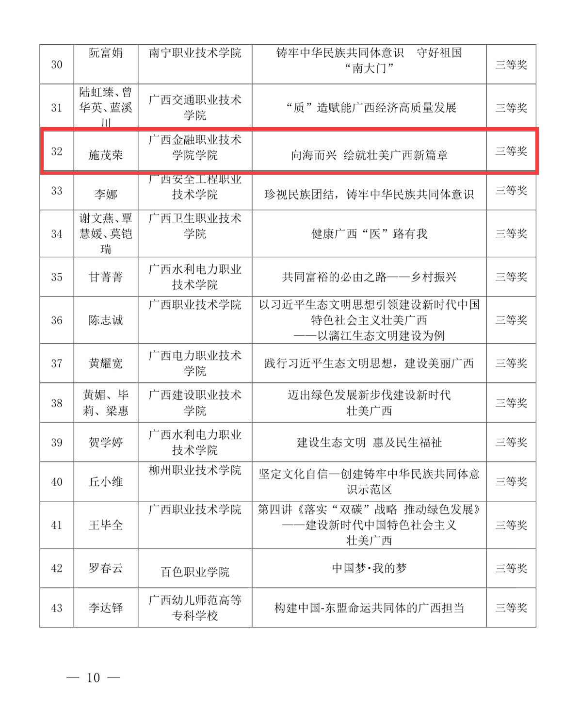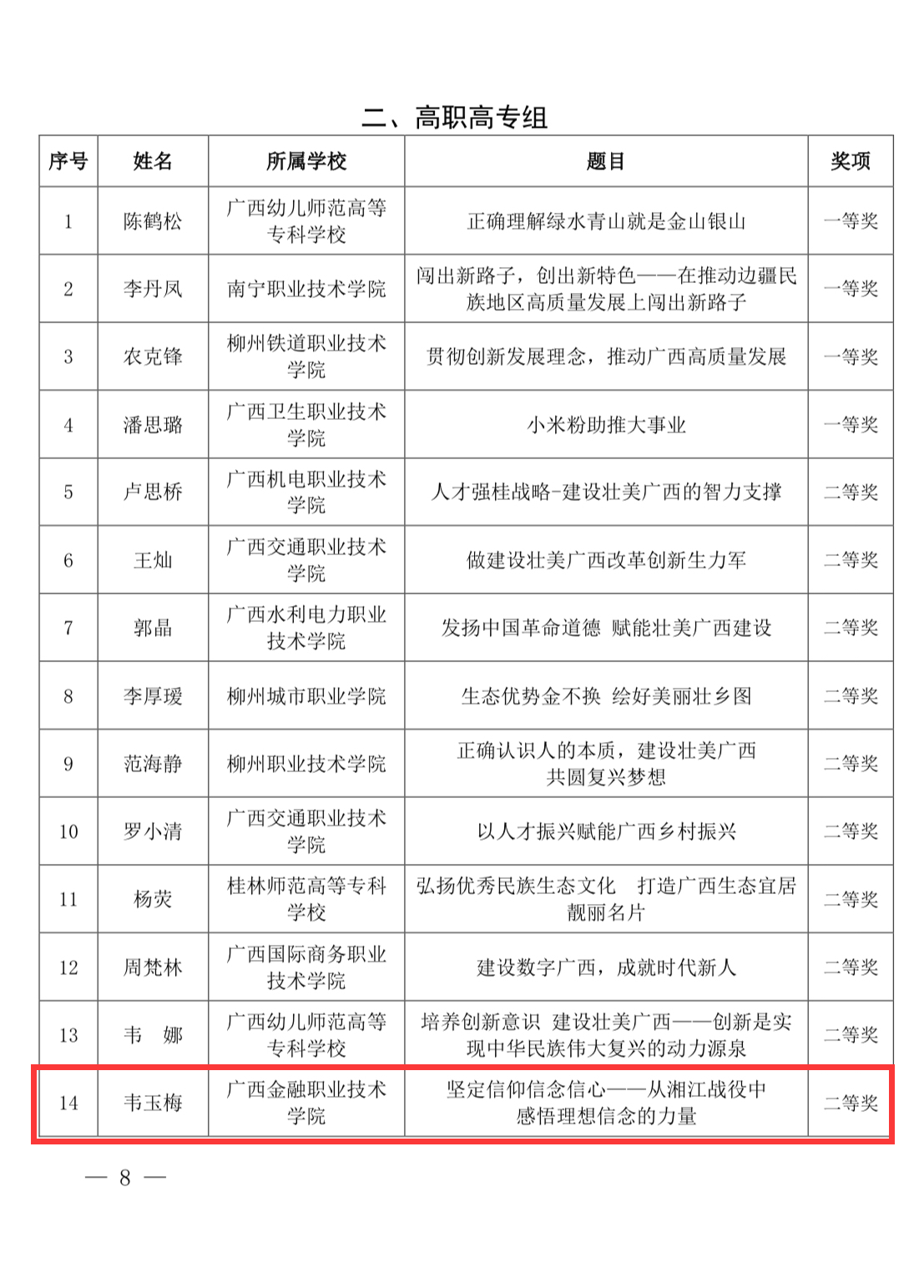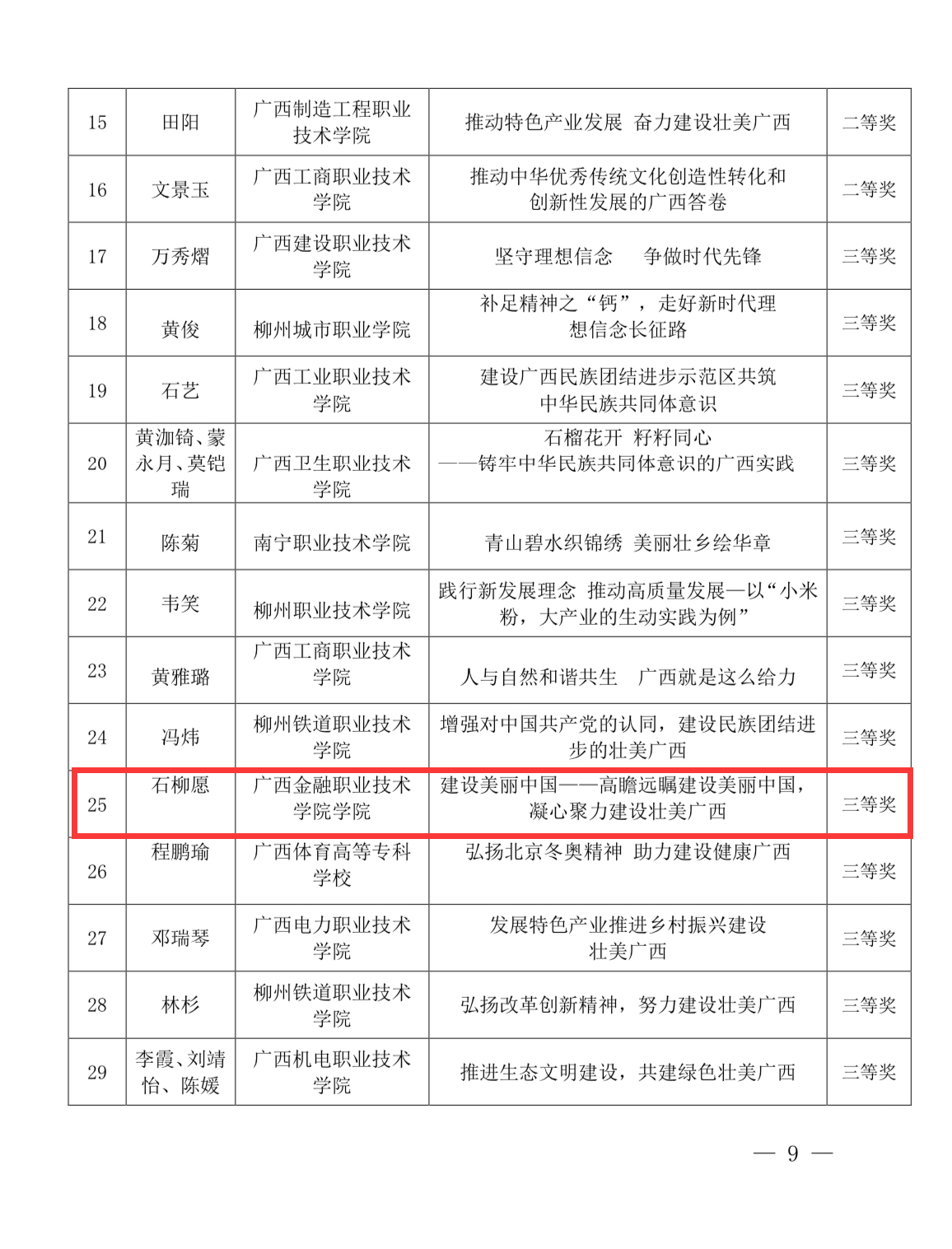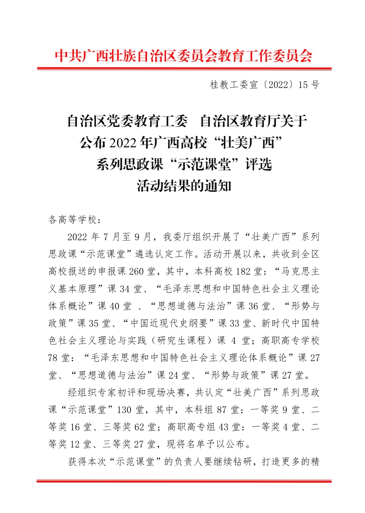 近期,自治區(qū)黨委教育工委、自治區(qū)教育廳公布2022年廣西高校“壯美廣西”系列思政課“示范課堂”獲獎名單。我校1堂思政課榮獲二等獎、2堂思政課榮獲三等獎。