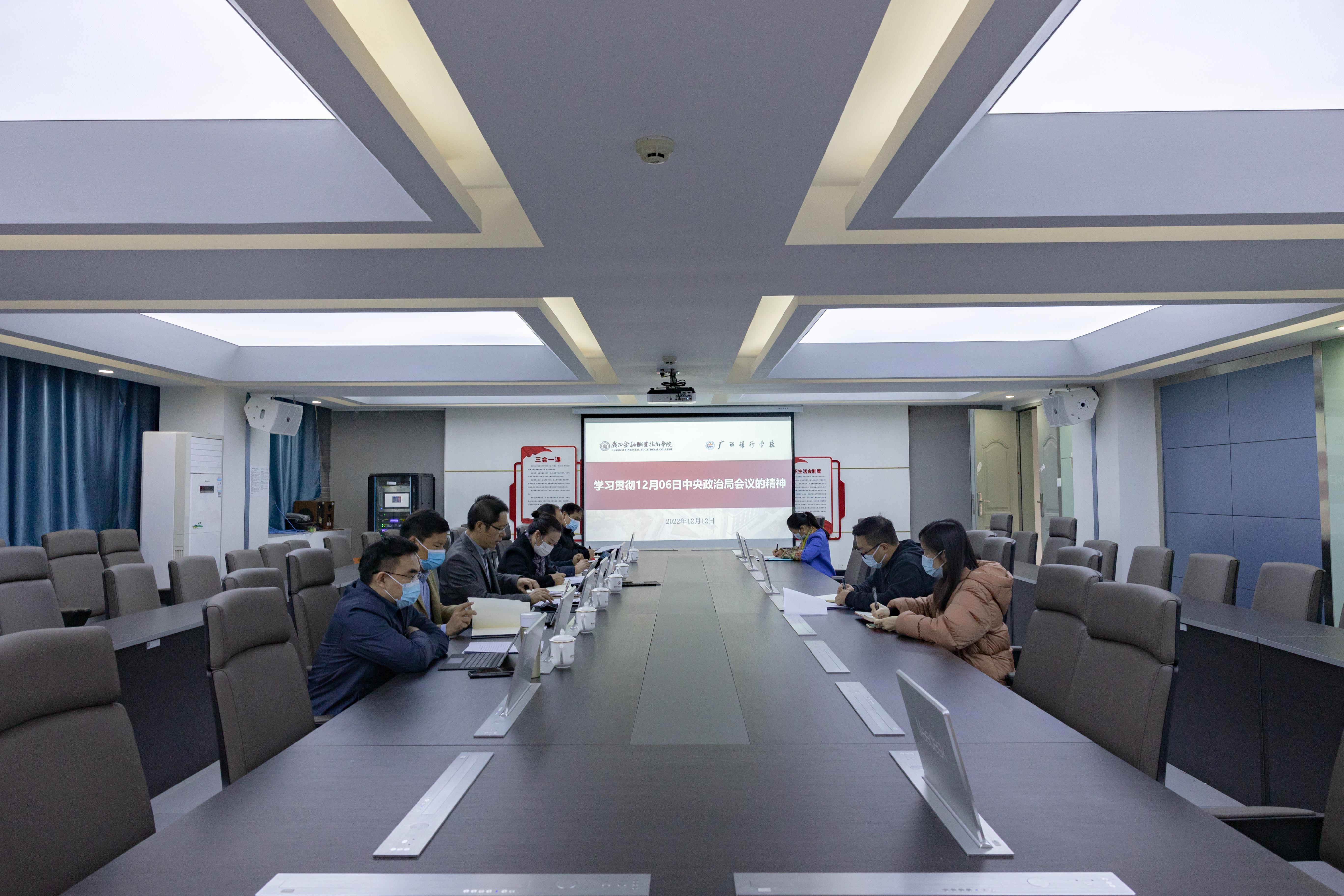 會議強調,要切實把思想和行動統一到習近平總書記在中央政治局會議上的重要講話精神上來。一要抓好今年的各項工作收官,做好期末放假相關工作的計劃安排,認真總結今年取得的各項成績,查擺不足。還要統籌謀劃好明年的開局工作,進一步振奮精神、增強信心,保持學校各項工作不斷向前。二要全面貫徹落實黨的二十大精神,全面貫徹新發展理念,推動學校事業發展不斷取得新的突破。還要堅持穩字當頭、穩中求進,統籌做好學校事業發展和疫情防控工作、學生就業工作,形成學校高質量發展的合力,為推動建設社會主義壯美廣西新篇章貢獻力量。三要統籌推進清廉學校建設各項工作,根據全區清廉學校建設工作推進視頻會議精神,扎實做好我校清廉學校建設的各項工作和完善各類臺賬,實現校風學風一流、師德師風優良目標,全面推動從嚴治黨向學校各個角落延伸,營造校園風清氣正、干事創業的良好政治生態。