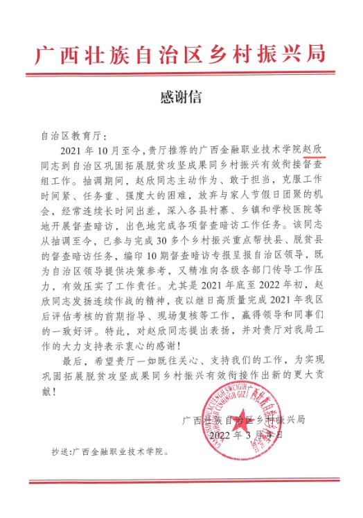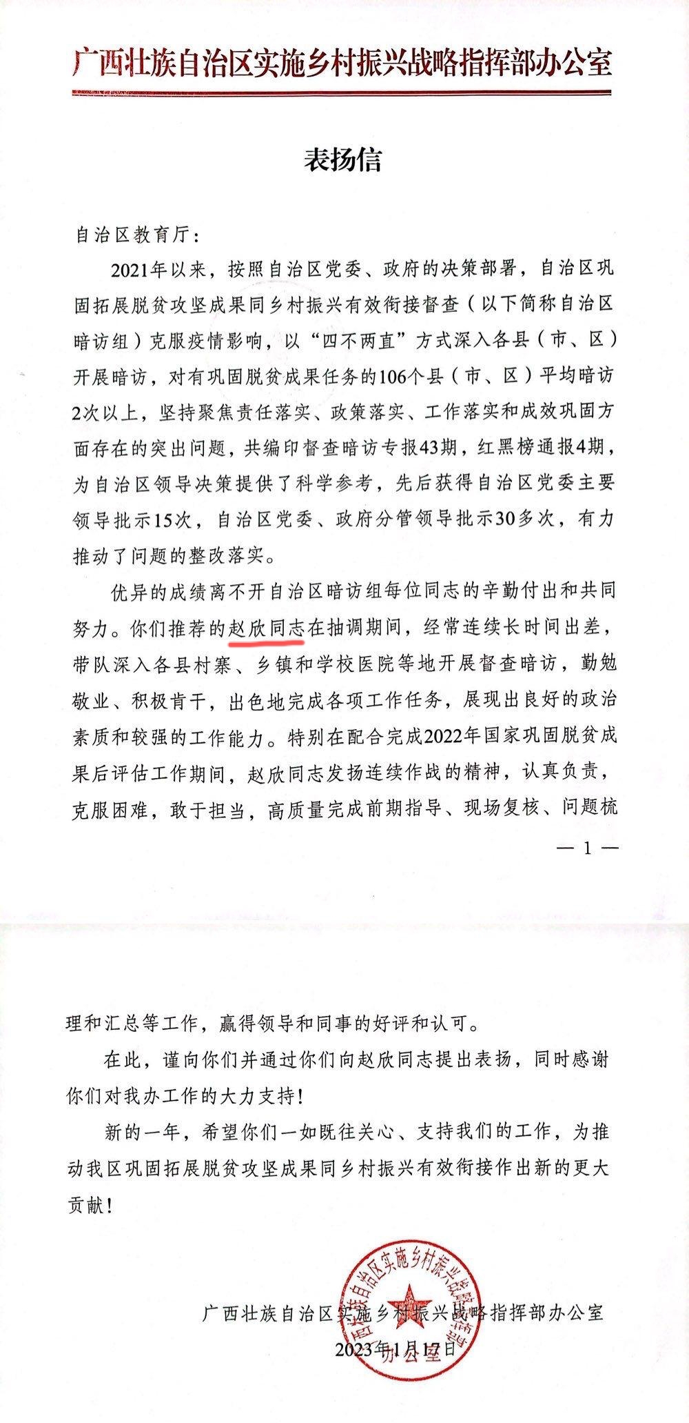 近日,我校趙欣同志受到自治區(qū)鄉(xiāng)村振興局、自治區(qū)實施鄉(xiāng)村振興戰(zhàn)略指揮部辦公室表揚。