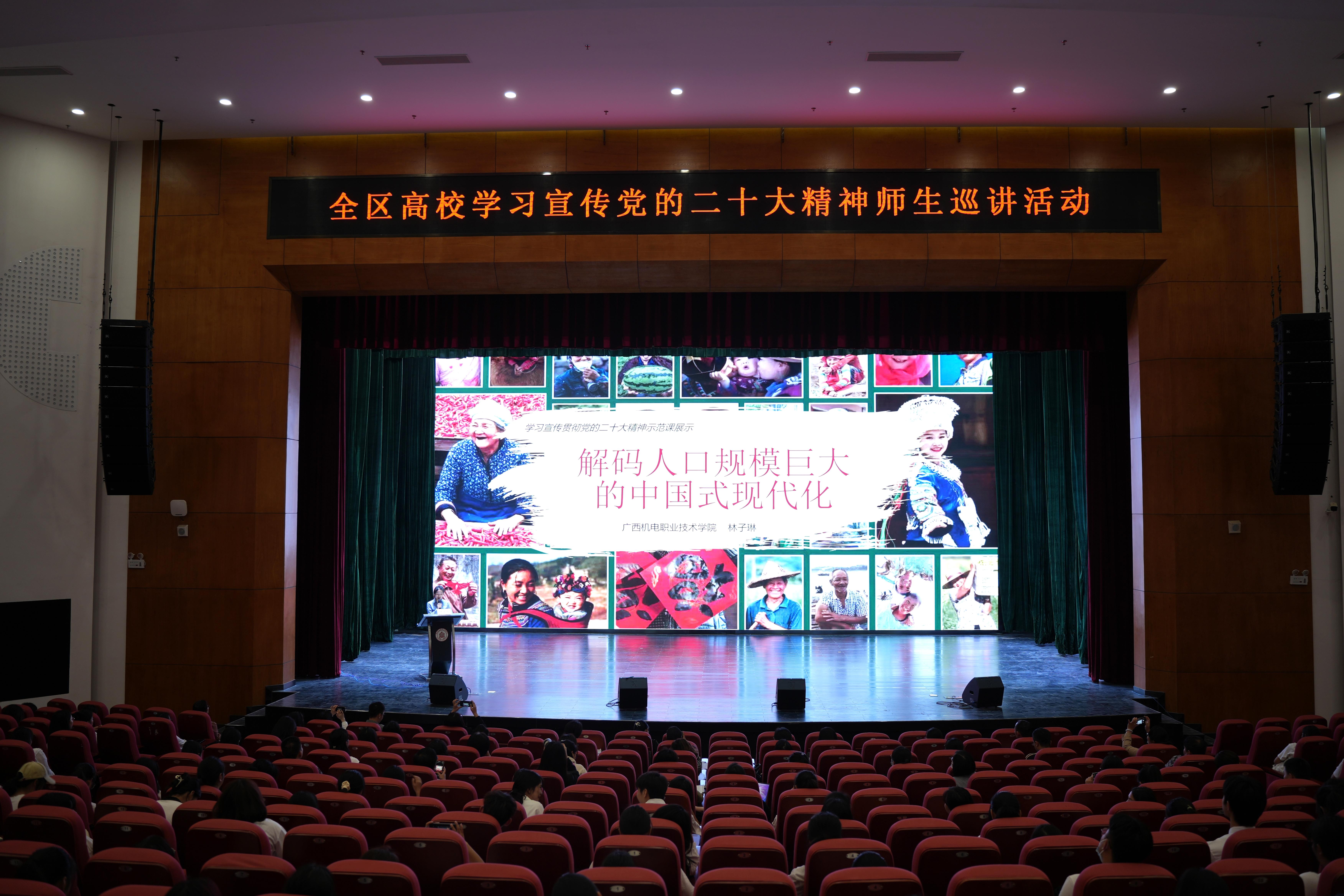 報(bào)告會(huì)上,廣西機(jī)電職業(yè)技術(shù)學(xué)院馬克思主義學(xué)院院長(zhǎng)、教授、自治區(qū)優(yōu)秀教師黃振宣,廣西幼兒師范高等專(zhuān)科學(xué)校馬克思主義學(xué)院副教授陳鶴松,南寧職業(yè)技術(shù)學(xué)院副教授黃玉霜,南寧職業(yè)技術(shù)學(xué)院國(guó)際學(xué)院副教授、廣西高校思想政治教育骨干教師、廣西最美輔導(dǎo)員林為湘,廣西機(jī)電職業(yè)技術(shù)學(xué)院馬克思主義學(xué)院講師林子琳分別從新征程上的“職教人”更加自信自強(qiáng)、推進(jìn)文化自信自強(qiáng) 爭(zhēng)做建設(shè)文化強(qiáng)國(guó)主力軍、讓青春在扎實(shí)推進(jìn)共同富裕火熱實(shí)踐中綻放絢麗之花、以黨的二十大精神筑牢高校網(wǎng)絡(luò)意識(shí)形態(tài)安全防線和解碼人口規(guī)模巨大的中國(guó)式現(xiàn)代化等五個(gè)主題為我校師生做了一場(chǎng)精彩紛呈的宣講。報(bào)告內(nèi)容貼合我校師生實(shí)際,主題鮮明、脈絡(luò)清晰、重點(diǎn)突出,有理論高度、有思想深度、有針對(duì)性、有時(shí)效性,師生們聽(tīng)后受益匪淺,深受鼓舞。