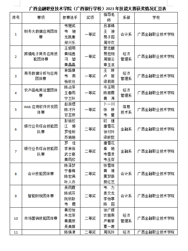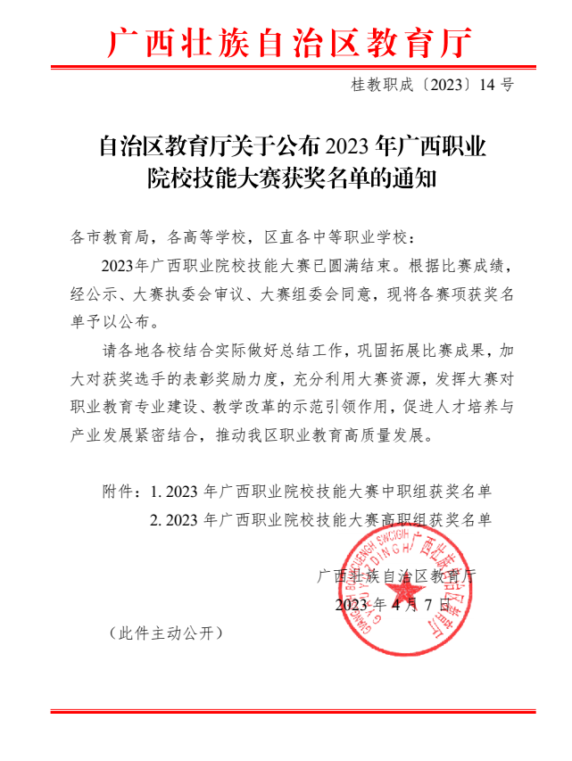 近日,由廣西壯族自治區教育廳主辦的2023年廣西職業院校技能大賽圓滿落幕,經過激烈角逐,我校派出的參賽隊伍共斬獲30個獎項,其中一等獎6項,二等獎10項,三等獎14項。
