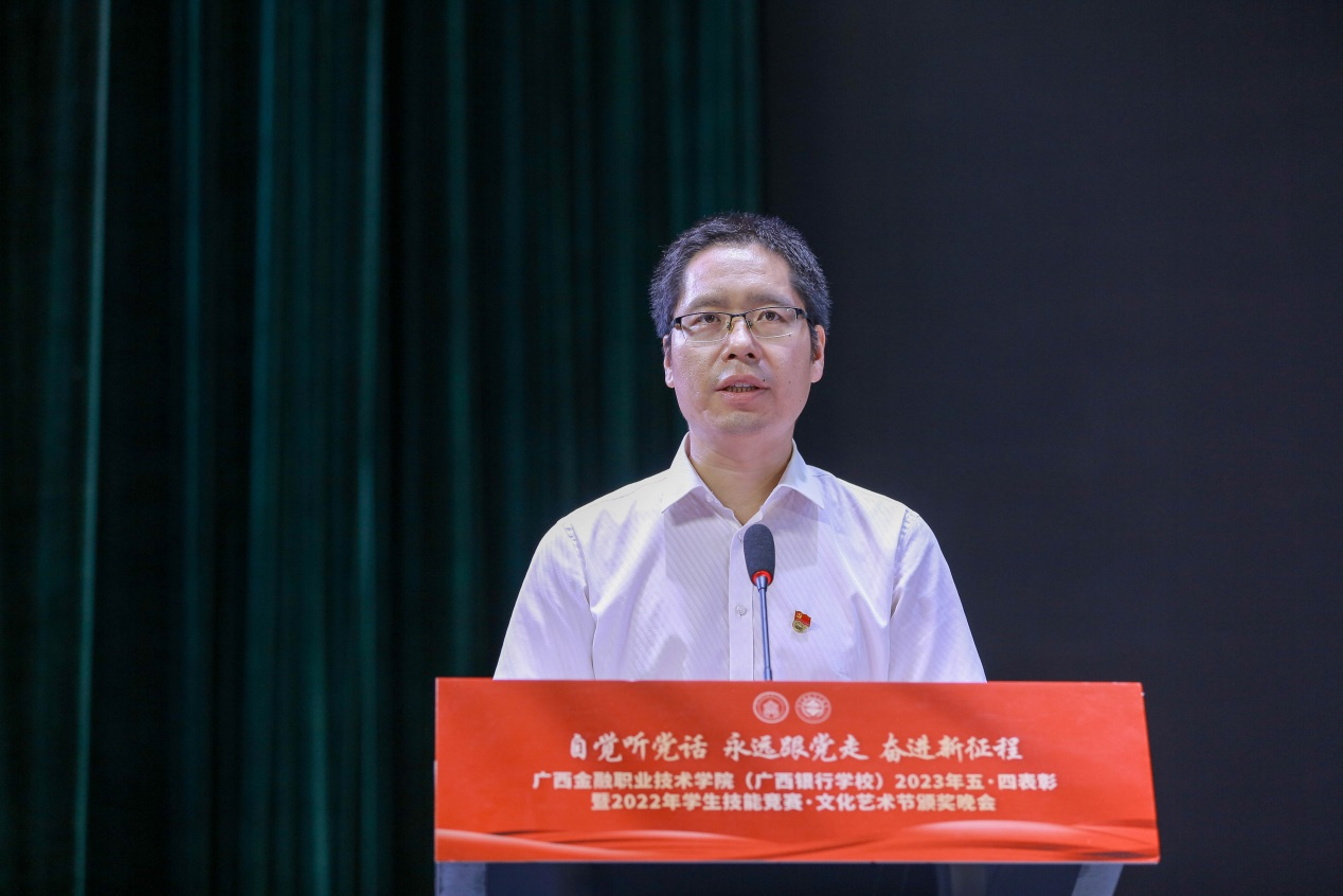 在致辭中,李高巖書記對廣大青年師生提出殷切希望:一是要堅定理想信念,做有理想的新時代青年;二是要錘煉過硬本領,做有本領的新時代青年;三是要弘揚時代精神,做有擔當的新時代青年。李書記勉勵廣大金院青年筑牢信仰之基,汲取奮進之志,以實際行動為為建設壯美廣西、實現中華民族偉大復興,加快學校建成“金融行業人才培養特色鮮明、位居國內同類院校先進行列”的廣西高水平高職學校貢獻青春力量。