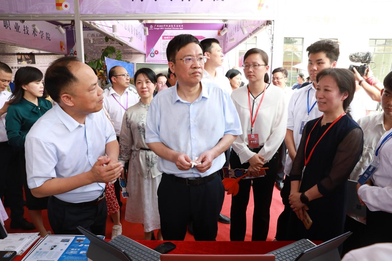 在主題展示現場,自治區黨委教育工委書記,自治區教育廳黨組書記、廳長劉友誼一行蒞臨我院展位參觀指導。學院師生代表展示了各專業的特色和風采,吸引了各級領導、嘉賓以及梧州市職業院校和中小學校師生代表駐足觀看。