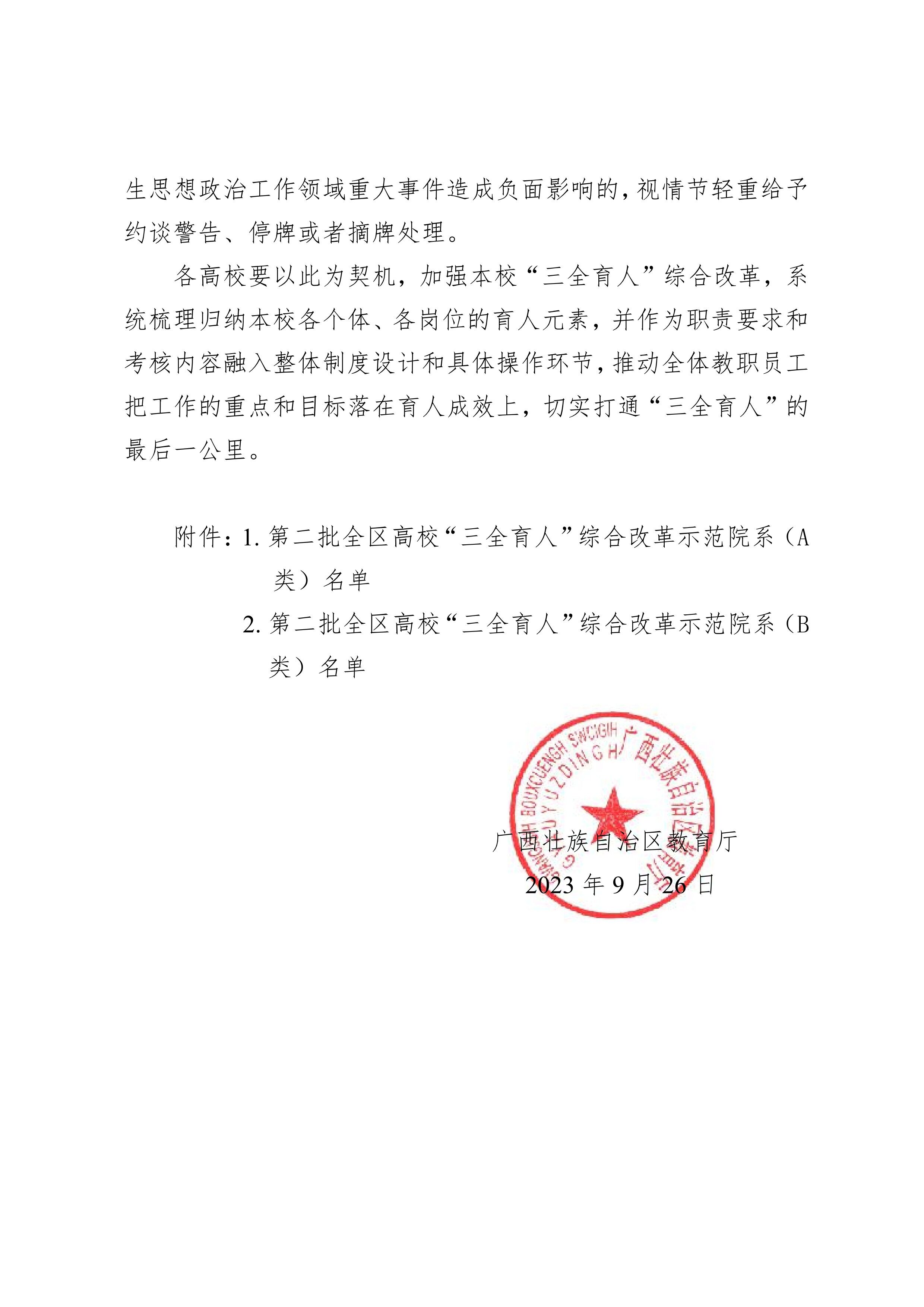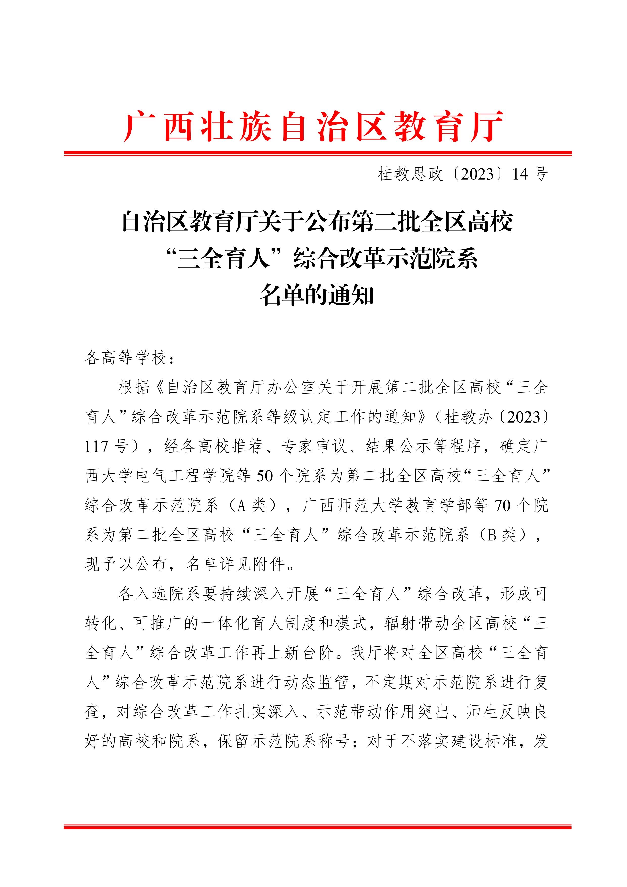 據(jù)悉,自治區(qū)高校“三全育人”綜合改革示范院系評(píng)選根據(jù)《自治區(qū)教育廳辦公室關(guān)于開(kāi)展第二批全區(qū)高校“三全育人”綜合改革示范院系等級(jí)認(rèn)定工作的通知》(桂教辦〔2023〕1117號(hào)),經(jīng)高校推薦、專(zhuān)家審議、結(jié)果公示等程序而最終確定,旨在以習(xí)近平新時(shí)代中國(guó)特色社會(huì)主義思想為指導(dǎo),堅(jiān)持和加強(qiáng)黨對(duì)教育的全面領(lǐng)導(dǎo),落實(shí)立德樹(shù)人根本任務(wù),推動(dòng)構(gòu)建全員協(xié)同、全程覆蓋、全方位滲透、職業(yè)教育特色突出的育人體系,形成思想價(jià)值引領(lǐng)貫穿教育教學(xué)全過(guò)程和各環(huán)節(jié)的長(zhǎng)效機(jī)制。