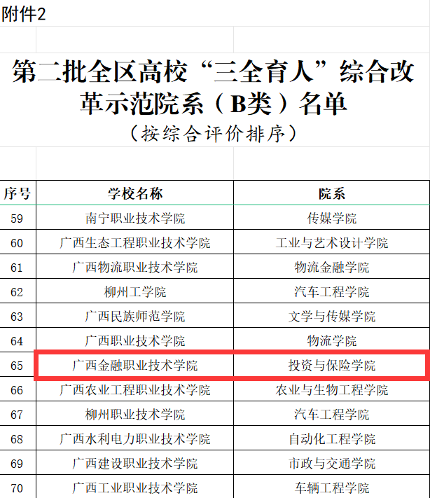 近日,自治區(qū)教育廳公布了第二批全區(qū)高校“三全育人”綜合改革示范院系名單,我校投資與保險(xiǎn)學(xué)院入選廣西高校“三全育人”綜合改革示范院系。