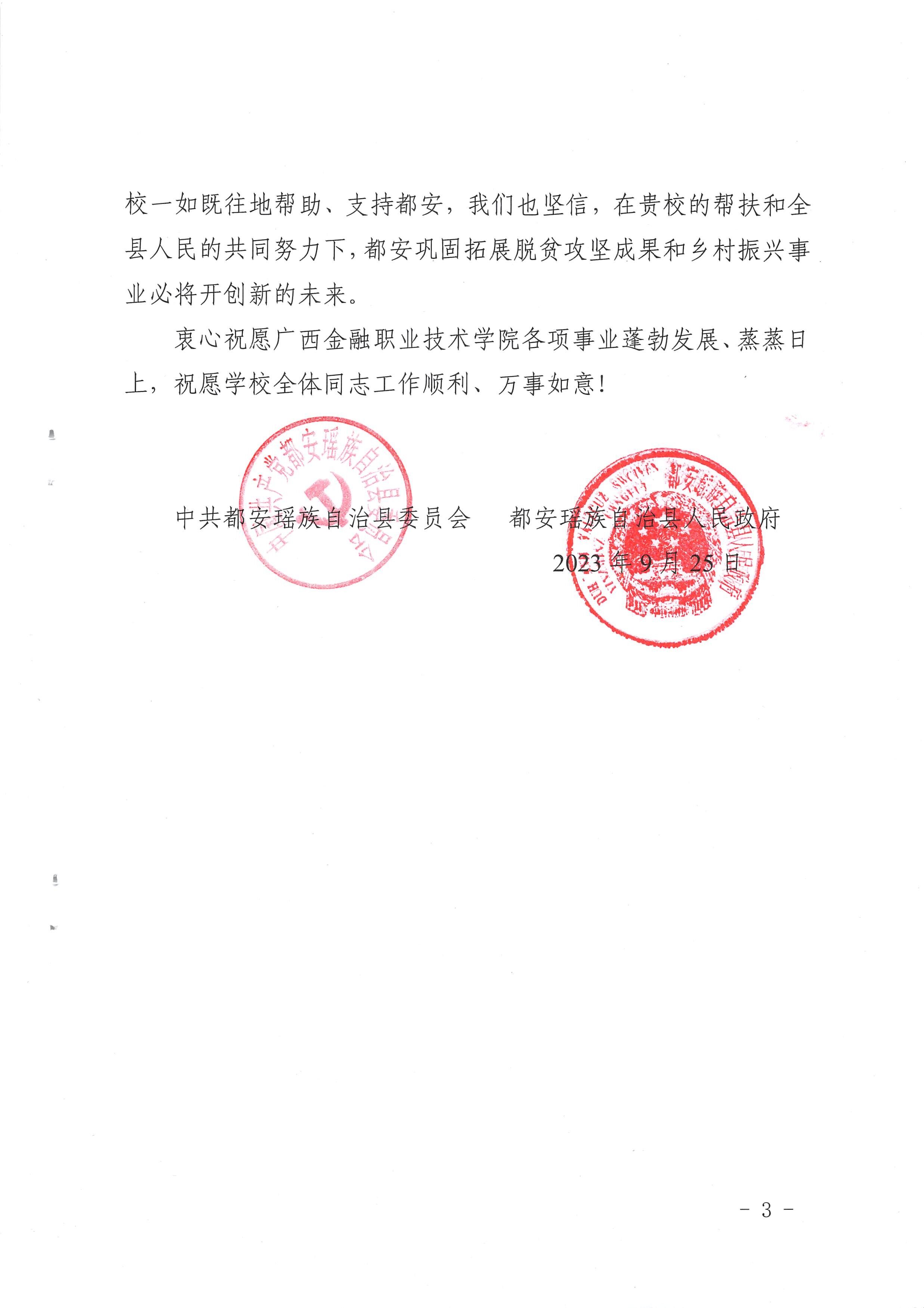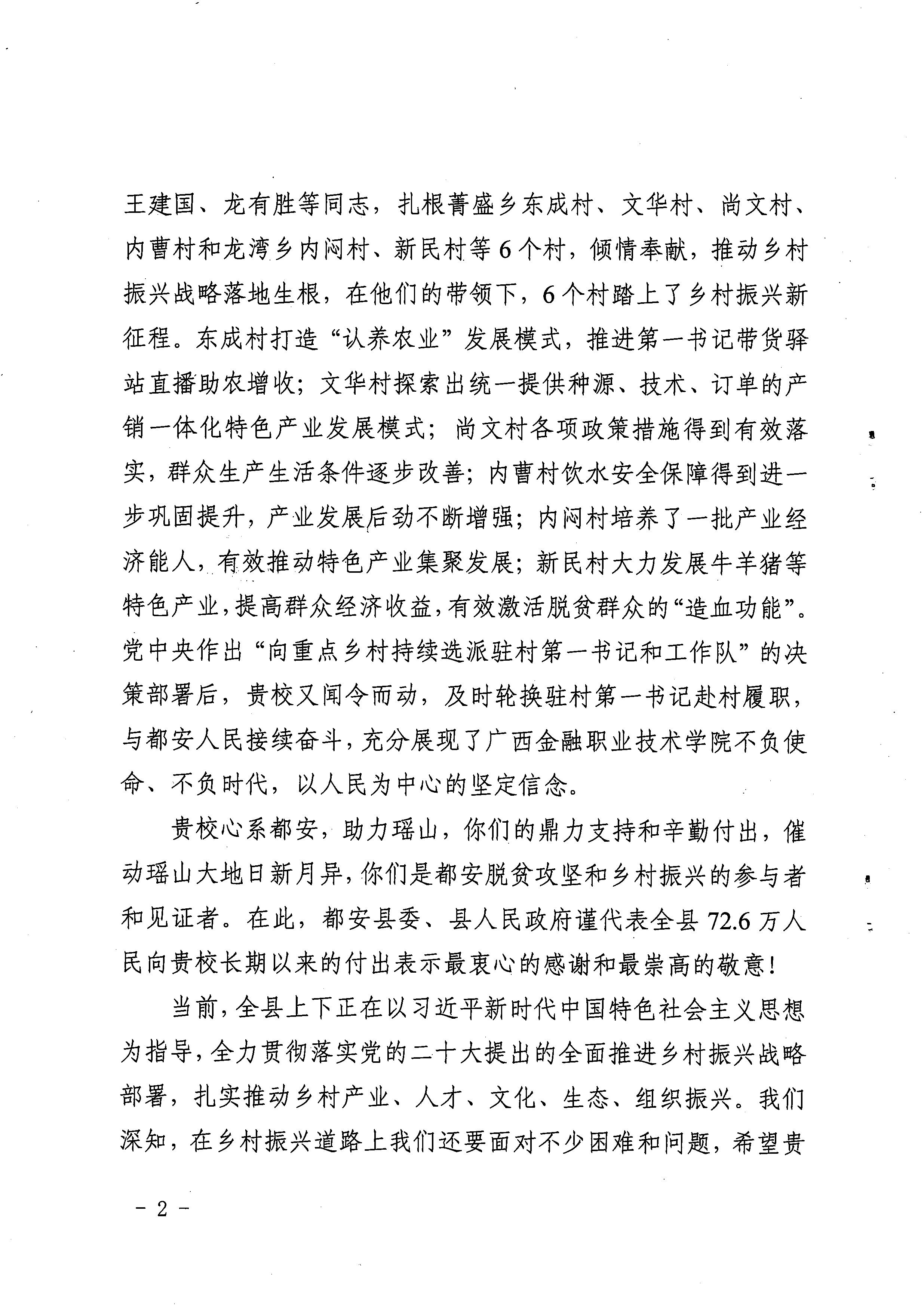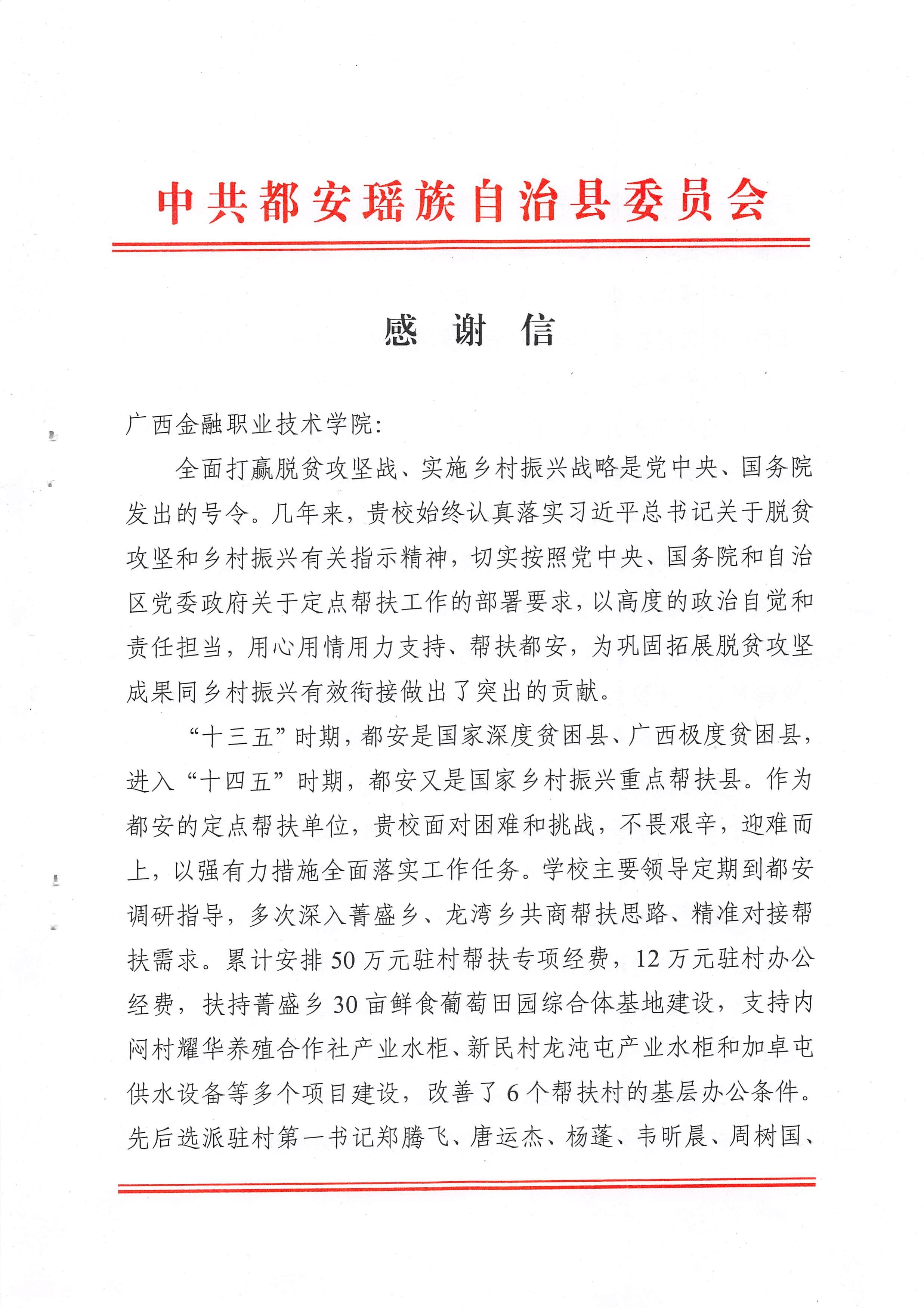 近日,中共都安瑤族自治縣委員會向我校發來《感謝信》,對我校支持、幫扶都安,鞏固拓展脫貧攻堅成果同鄉村振興有效銜接做出的突出貢獻表示感謝,就我校選派的駐村第一書記鄭騰飛、唐運杰、楊蓬、韋昕晨、周樹國、王建國、龍有勝等同志高標準高質量完成所承擔的各項工作任務給予高度評價。