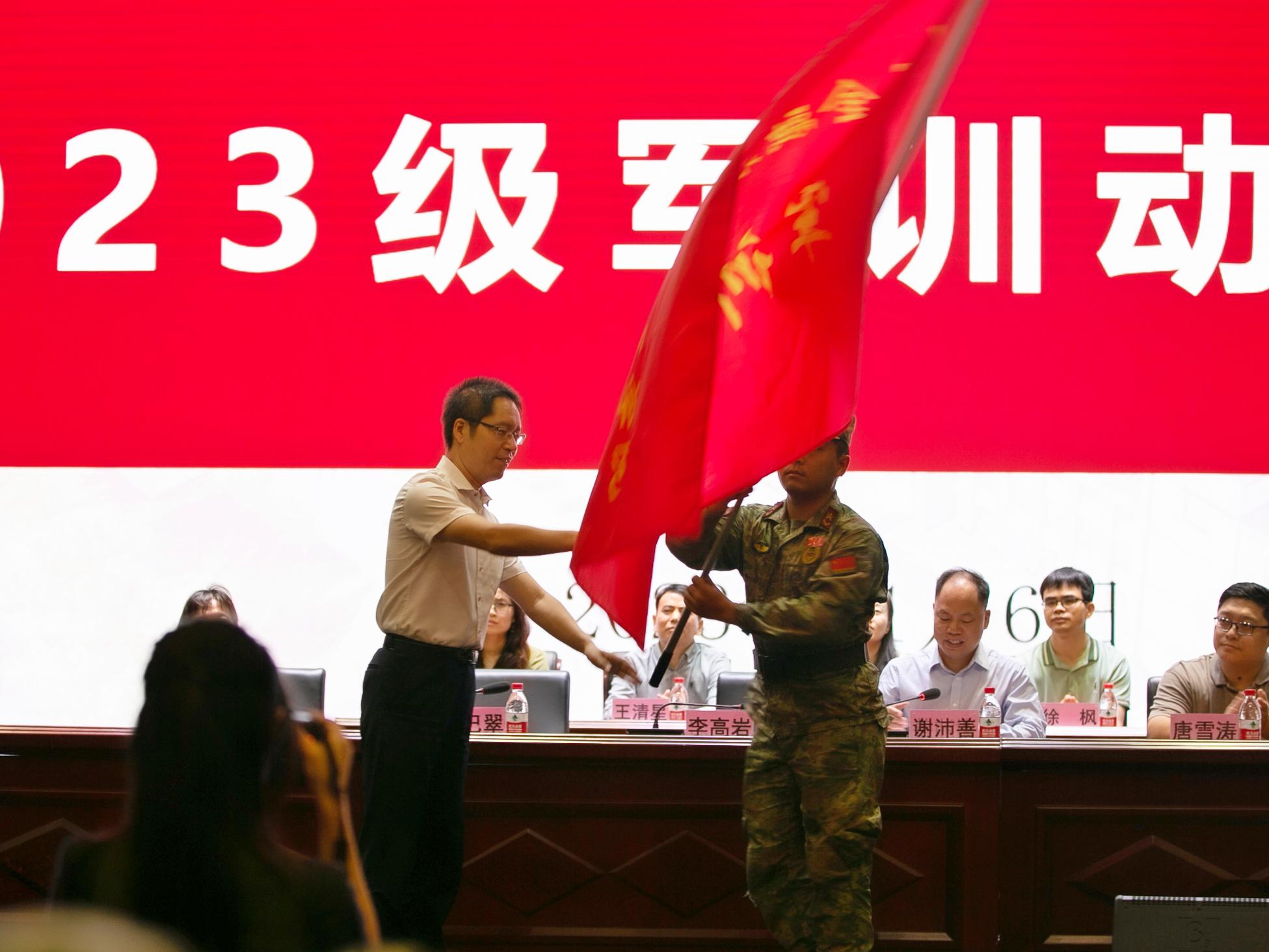 會上,李高巖書記和莫海燕院長向承訓單位授軍訓團團旗,鮮紅的旗幟高高飛揚,標志著我校2023級高職學生軍訓正式拉開帷幕。