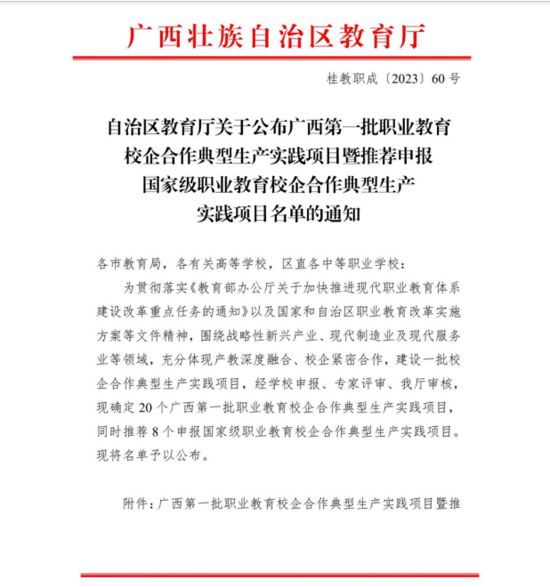 熱烈祝賀我校“RCEP數(shù)字貿(mào)易典型生產(chǎn)實(shí)踐項(xiàng)目”成功入選廣西第一批職業(yè)教育校企合作典型生產(chǎn)實(shí)踐項(xiàng)目。