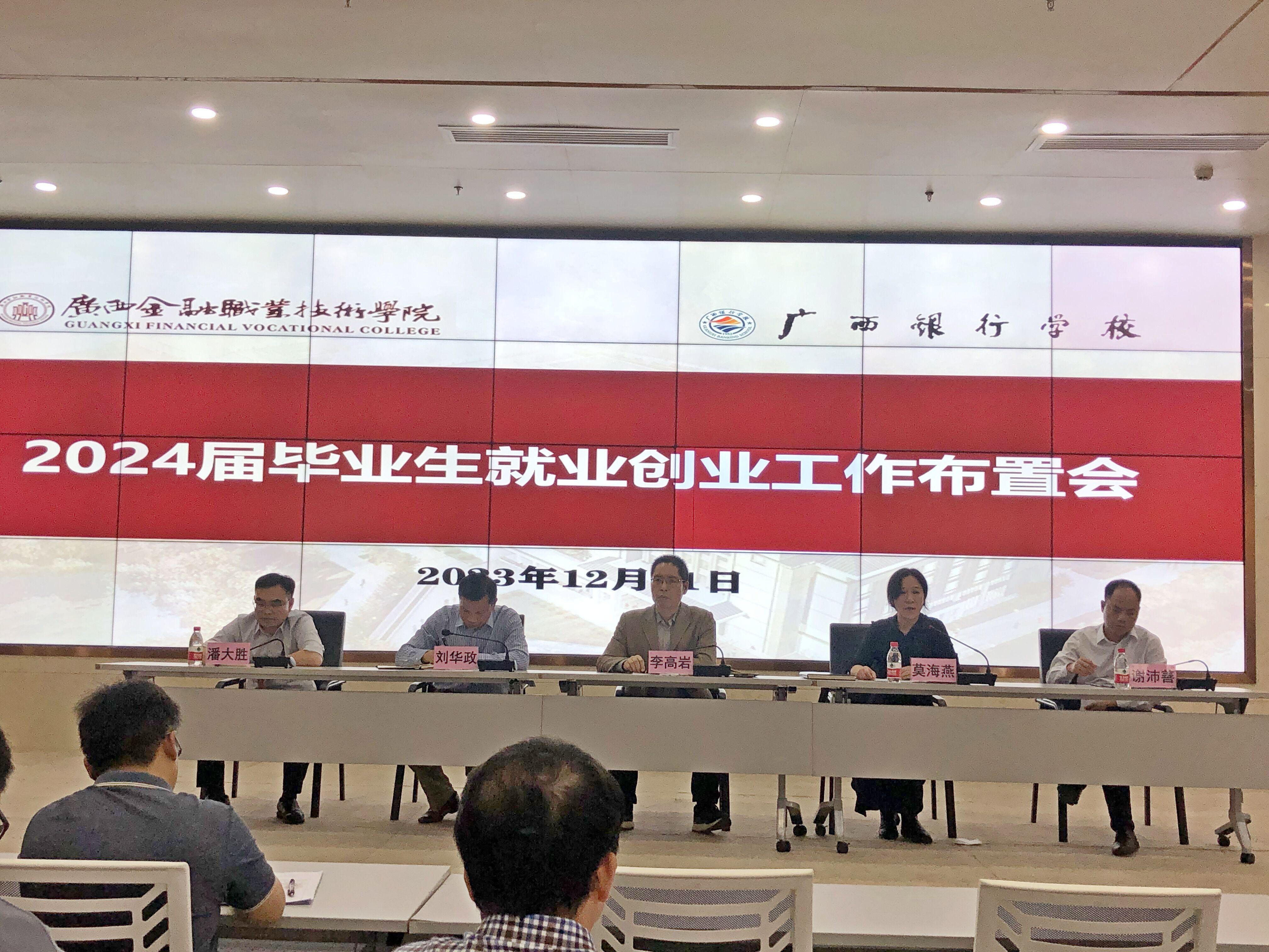 12月11日上午,廣西金融職業(yè)技術(shù)學(xué)院2024屆畢業(yè)生就業(yè)創(chuàng)業(yè)工作布置會(huì)在西校區(qū)道德大講堂召開,黨委書記李高巖、校長莫海燕出席會(huì)議并講話,黨委副書記、紀(jì)委書記劉華政主持會(huì)議并講話。校領(lǐng)導(dǎo)、各二層單位負(fù)責(zé)人、招生就業(yè)處全體成員、各系就業(yè)專干和2024屆畢業(yè)班輔導(dǎo)員等參加會(huì)議。