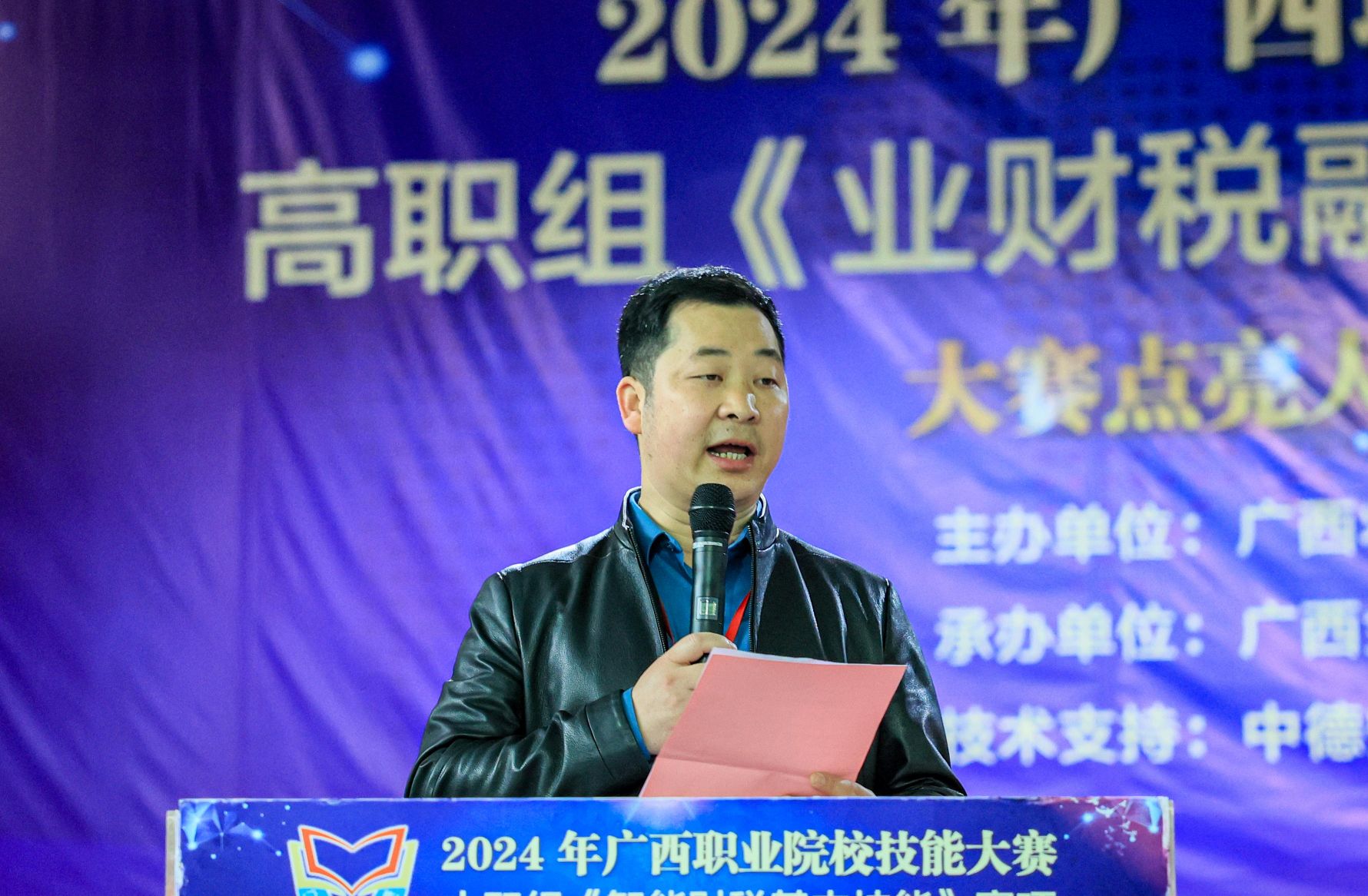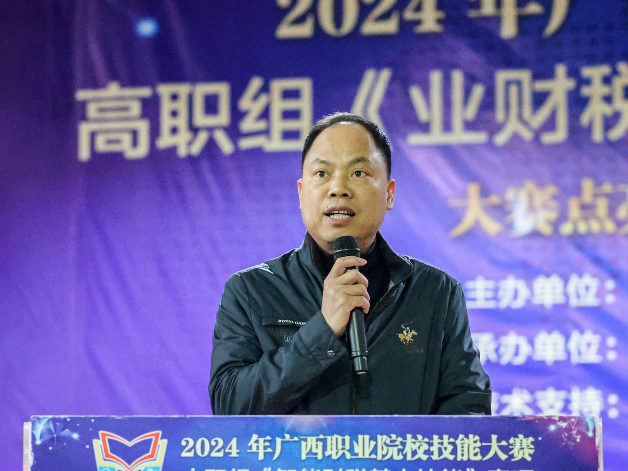 我校副校長謝沛善出席開幕儀式并致辭,他首先代表學(xué)校全體師生,向遠道而來的各位裁判、領(lǐng)隊和參賽選手表示歡迎與感謝。他表示,《業(yè)財稅融合大數(shù)據(jù)應(yīng)用》賽項的舉辦能夠推動廣西職業(yè)教育與大數(shù)據(jù)產(chǎn)業(yè)的深度融合,培養(yǎng)具備業(yè)財稅融合能力的高素質(zhì)技能人才,期待通過這次比賽,全方位展示廣西職業(yè)院校的教學(xué)成果,激發(fā)廣大學(xué)子對業(yè)財稅融合大數(shù)據(jù)應(yīng)用領(lǐng)域的興趣和熱情,為未來的職業(yè)發(fā)展奠定堅實的基礎(chǔ)。