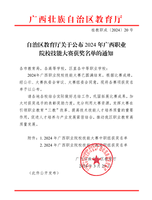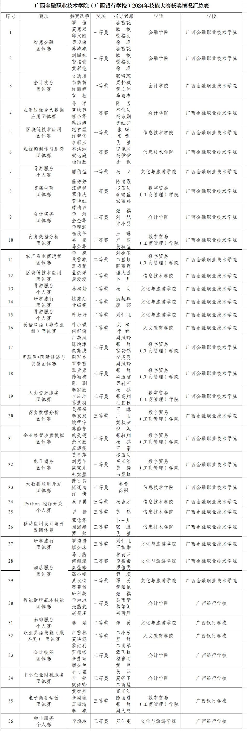 近日,由廣西壯族自治區教育廳主辦的2024年廣西職業院校技能大賽圓滿落幕。本次大賽學校共選派出131名選手參加34個賽項的角逐,根據自治區教育廳公布的獲獎名單,我校獲獎數量共36項,獲獎人數102人,獲獎率達到77.86%,獲獎總數創歷史新高。其中,高職組一等獎8項,中職組一等獎1項;高職組二等獎8項,中職組二等獎3項;高職組三等獎13項,中職組三等獎3項,同比增長33.33%。區塊鏈技術應用、業財稅融合大數據應用、會計實務、短視頻創作與運營、直播電商、導游服務、智能財稅基本技能賽項各獲賽項各獲一等獎1項,智慧金融賽項獲得一等獎2項。
