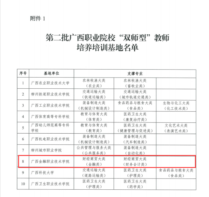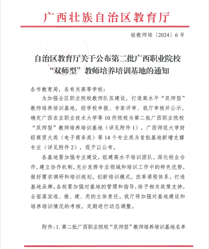 近日,自治區教育廳印發《關于公布第二批廣西職業院校“雙師型”教師培養培訓基地的通知》(桂教師培﹝2024﹞6號),經專家評審、自治區教育廳審核遴選并公示無異議后,我校成功入選第二批廣西職業院校“雙師型”教師培養培訓基地,支撐專業為財經商貿大類的金融類和財務會計類。
