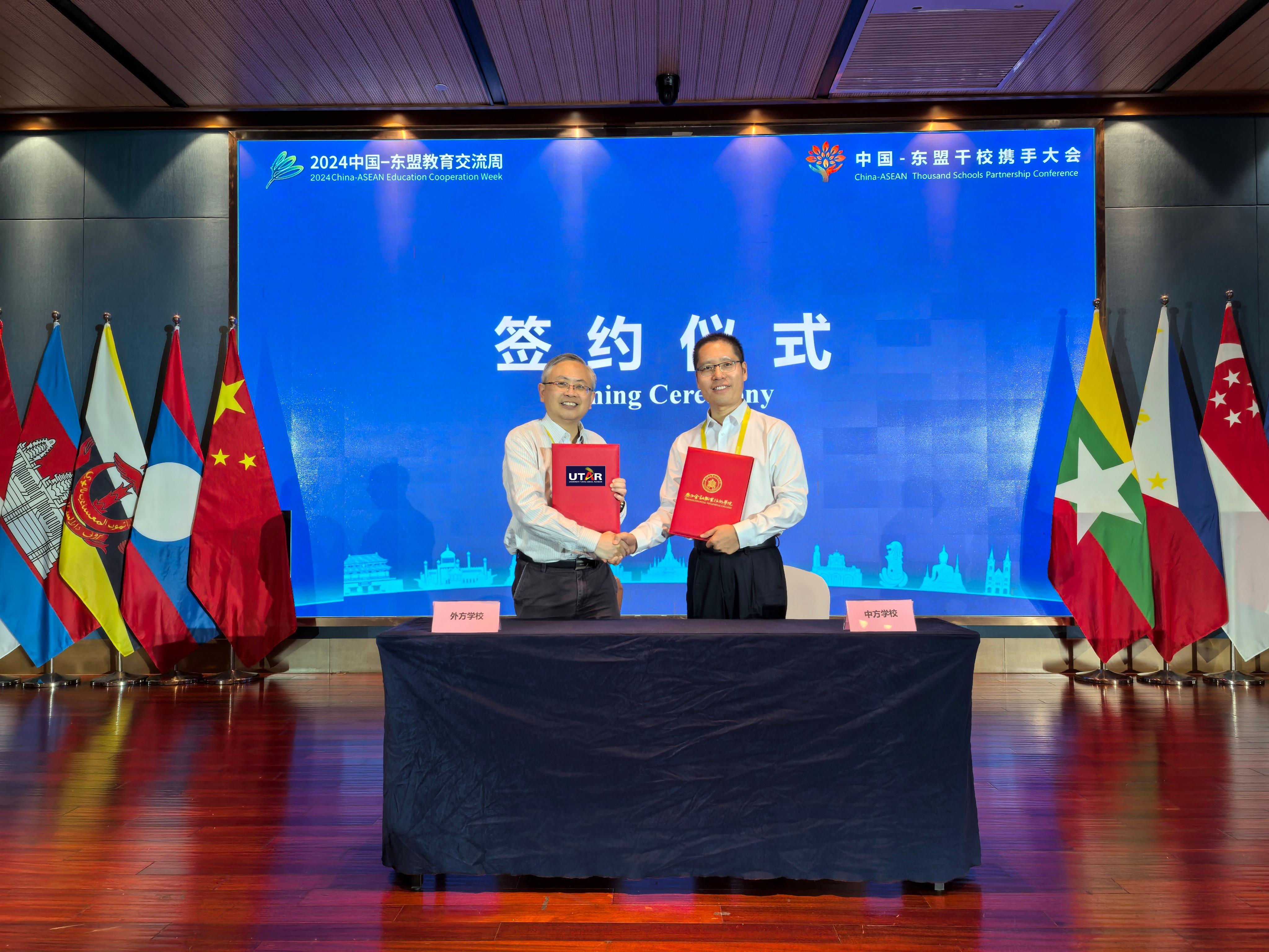 會上,舉行了14組中國—東盟項目學校代表簽約儀式。我校作為廣西職業院校啟動代表單位參會,李高巖書記代表我校與馬來西亞拉曼大學、泰國澈督蓬商業學院領導上臺簽約,由此攜手開啟長期戰略合作關系。