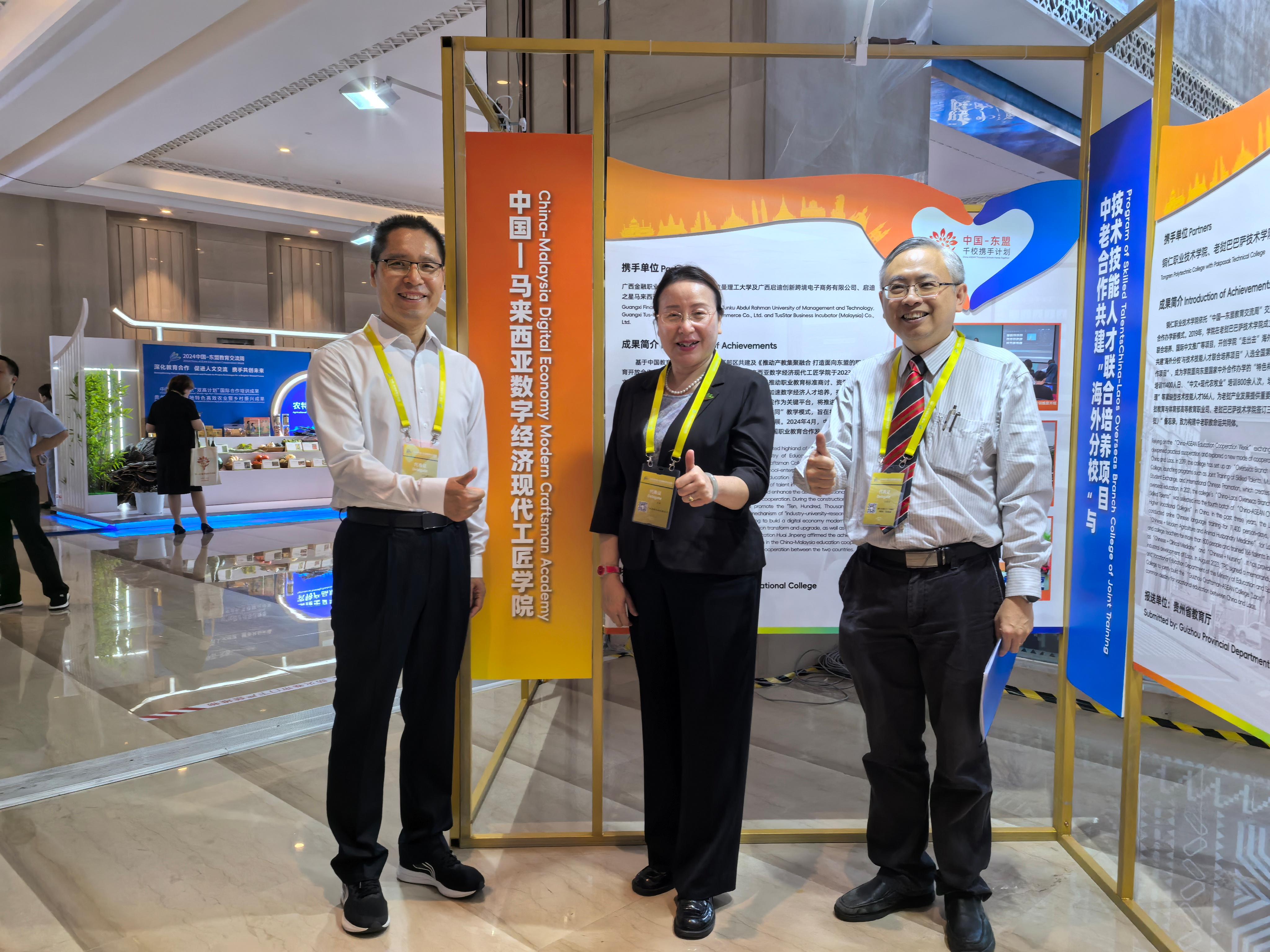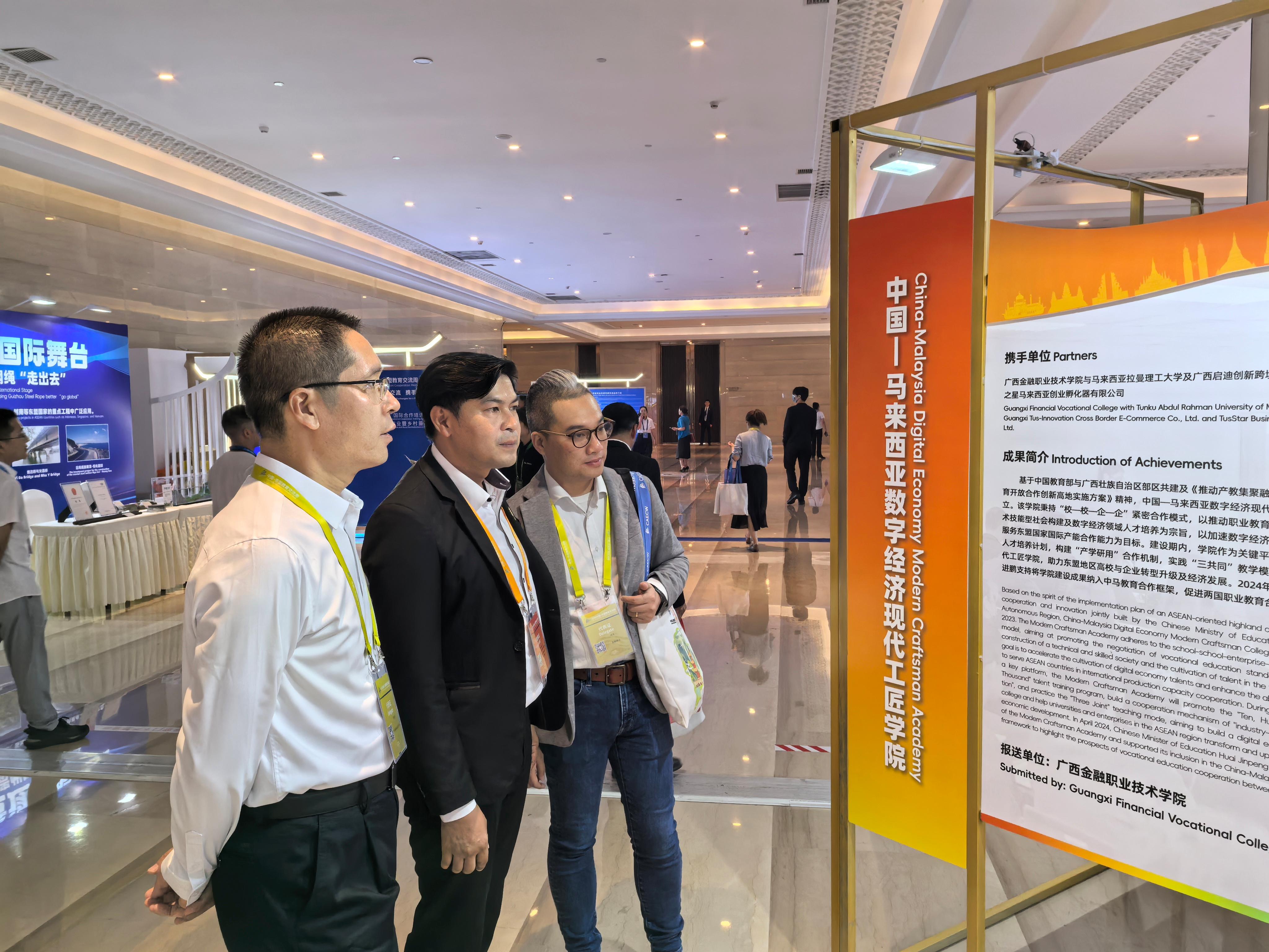 會議期間,中外嘉賓駐足參觀“中國—馬來西亞數字經濟現代工匠學院”成果展位,對我校對外合作辦學成果予以高度評價。