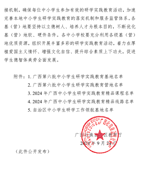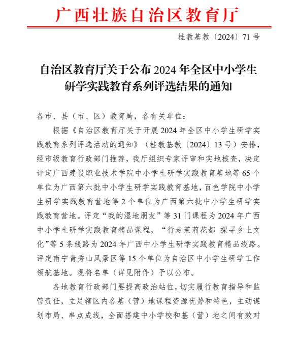 近日,廣西壯族自治區(qū)教育廳發(fā)布了《自治區(qū)教育廳關于公布2024年全區(qū)中小學生研學實踐教育系列評選結果的通知》(桂教基教〔2024〕71號),我校組織申報的中小學生研學實踐教育基地經(jīng)遴選推薦、自治區(qū)教育廳專家進行初評和實地核查,最終成功入選廣西第六批中小學生研學實踐教育基地。