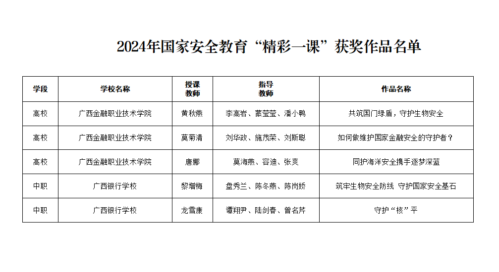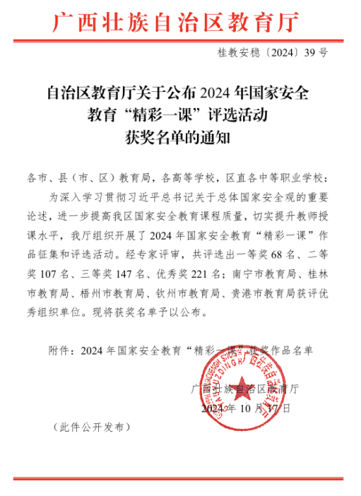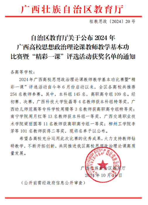 近日,根據廣西壯族自治區教育廳公布的2024年全區國家安全教育“精彩一課”評選活動獲獎名單、2024年廣西高校思想政治理論課教師教學基本功比賽暨“精彩一課”評選活動獲獎名單,我校馬克思主義學院參賽教師喜獲佳績,分別榮獲一等獎一項、二等獎三項、三等獎兩項。