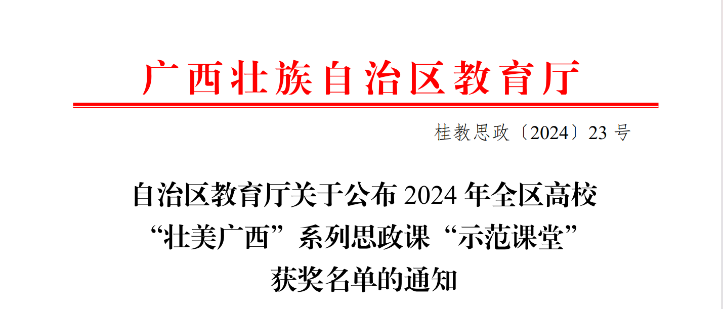 近日,廣西壯族自治區教育廳公布2024年全區高校“壯美廣西”系列思政課“示范課堂”評選活動結果,我校馬克思主義學院教師榮獲一等獎1項、二等獎1項、三等獎2項的好成績。