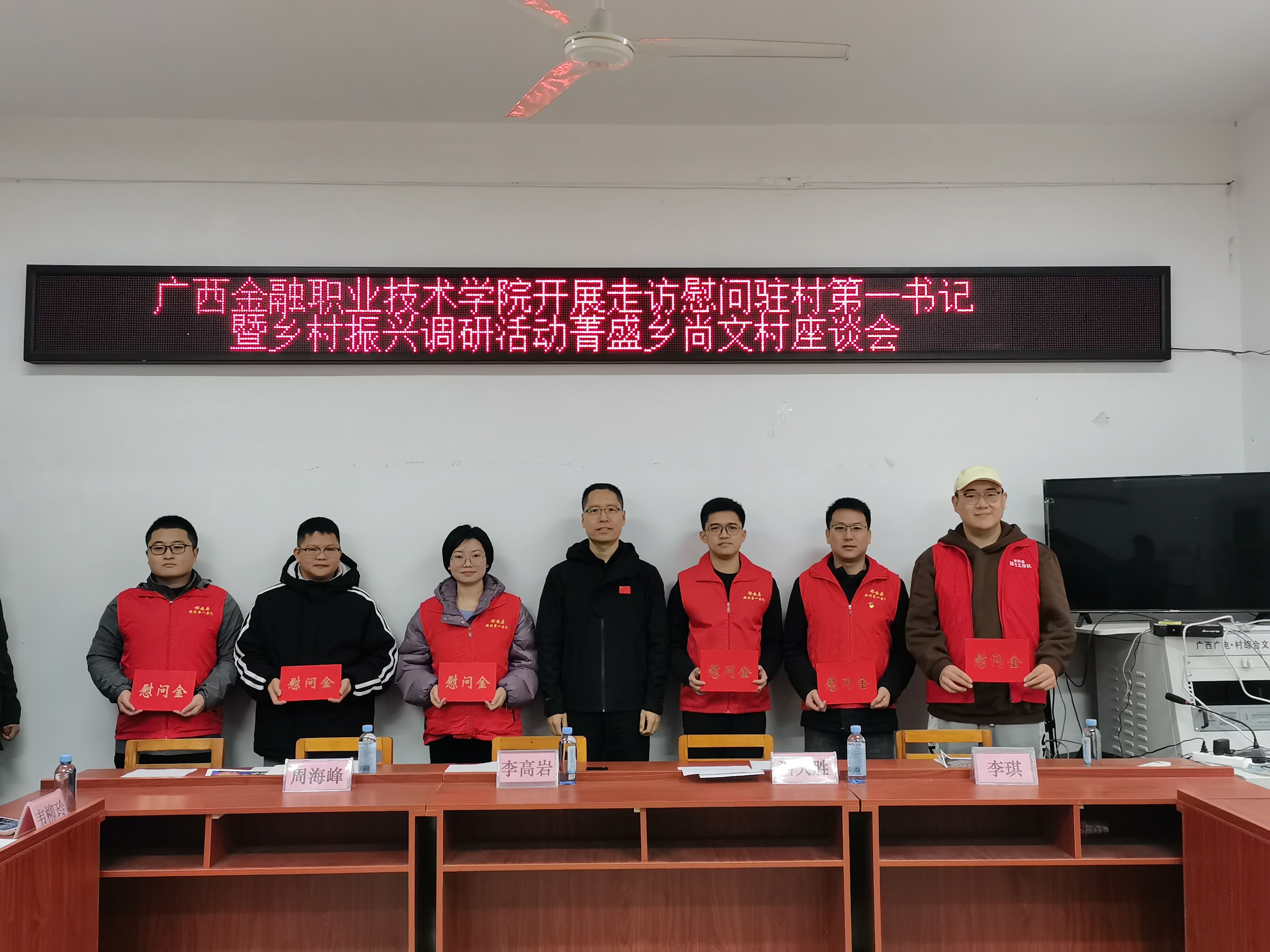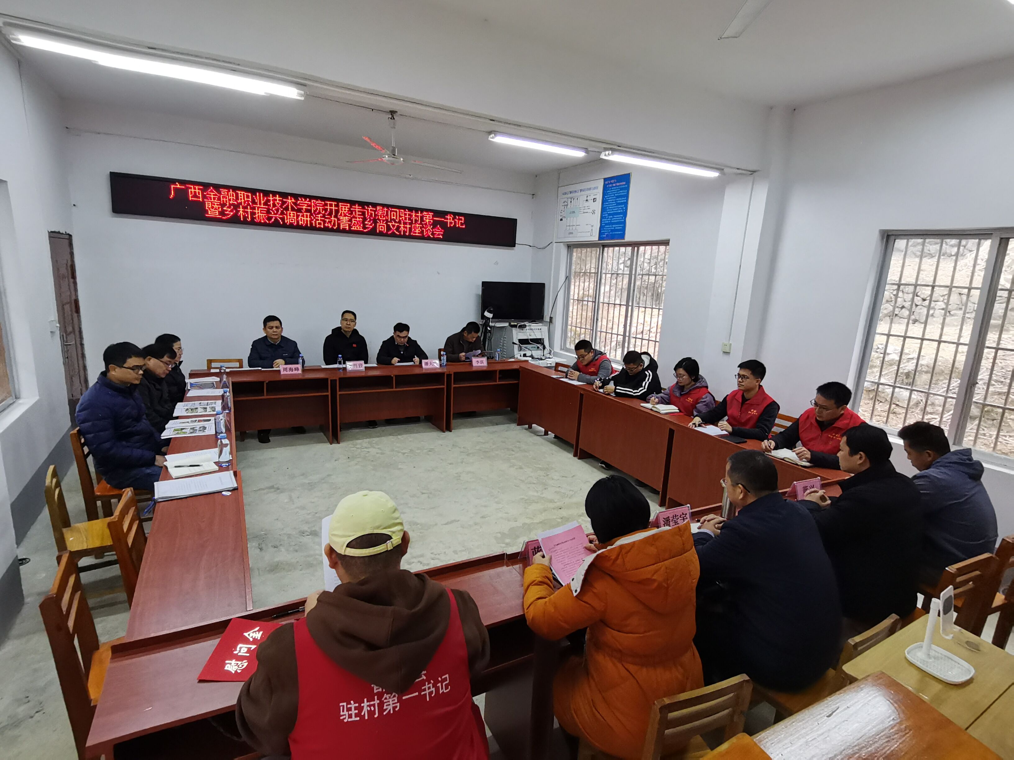 我校定點幫扶村開展走訪慰問駐村第一書記暨鄉村振興調研活動座談會在菁盛鄉尚文村召開。學校黨委書記李高巖、都安縣人大常委會副主任潘瑩宇、菁盛鄉黨委書記藍艷恒出席座談會,座談會由學校黨委委員、副校長潘大勝主持,各駐村第一書記及其所在部門負責人參加座談會。