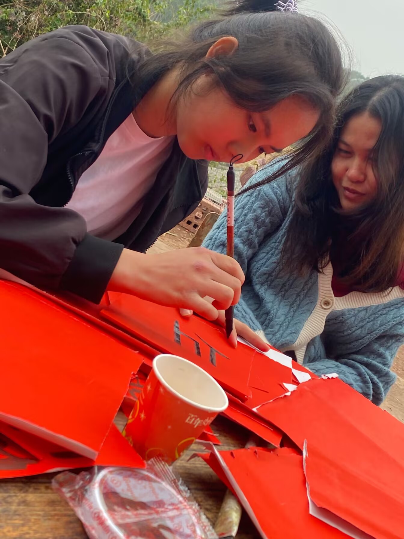 隨后,大家來到張冠老師家中,體驗和學習毛筆字的書寫。在老師的耐心指導下,學生們手執毛筆,蘸墨揮毫,一筆一劃地書寫著漢字。紅紙濃墨間,一個個形態各異的漢字躍然紙上,雖然筆觸略顯稚嫩,但每一個字都飽含著他們對中華傳統文化的向往與崇敬,也寄托著對學校和老師的美好祝福。
