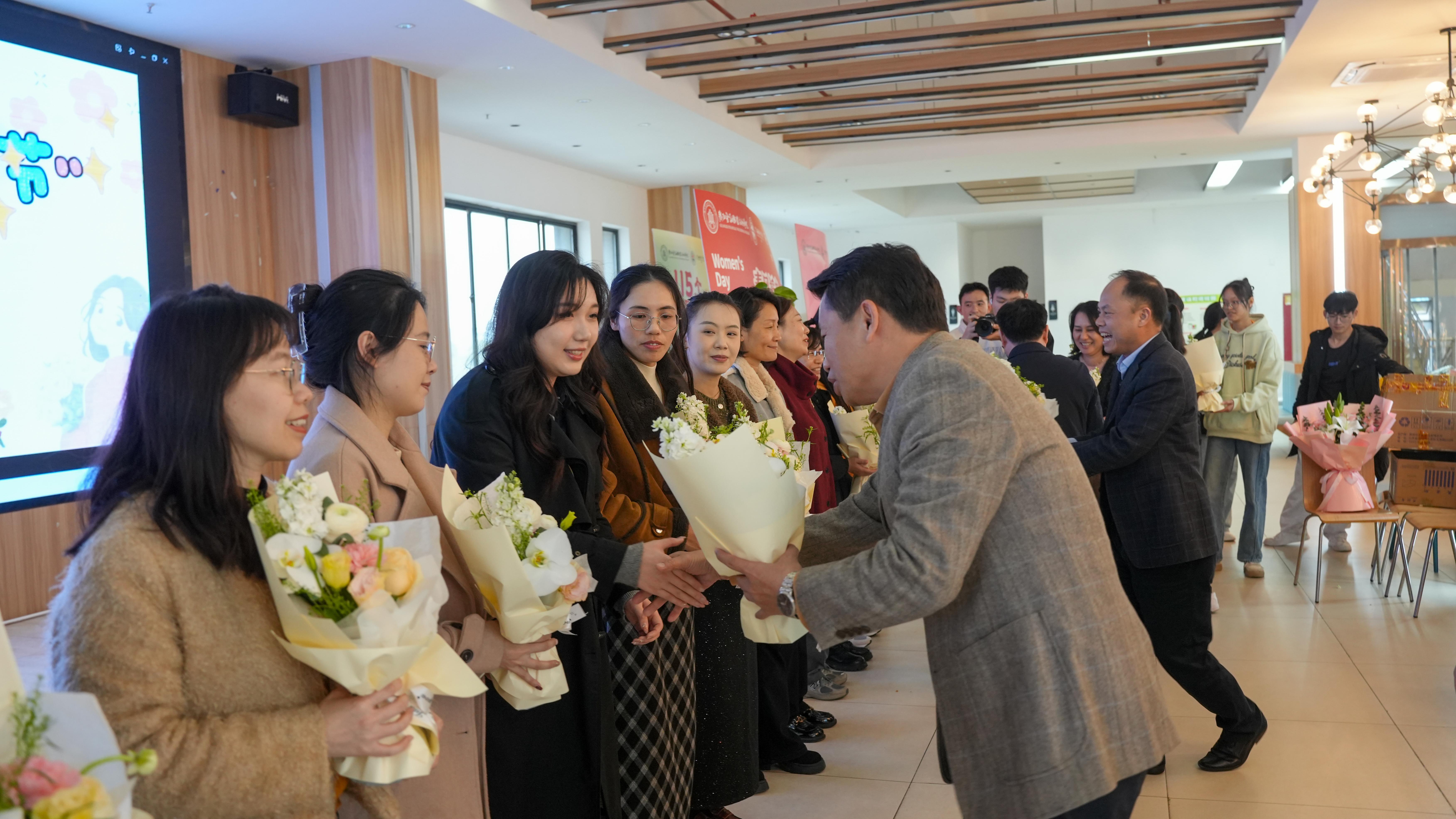 隨后李高巖書記代表全體男教職工向以莫海燕校長為代表的女教職工們獻上鮮花,劉華政副書記、謝沛善副校長、潘大勝副校長為各工會小組女職工代表獻上鮮花,這一溫馨舉動讓現場氣氛更加融洽。