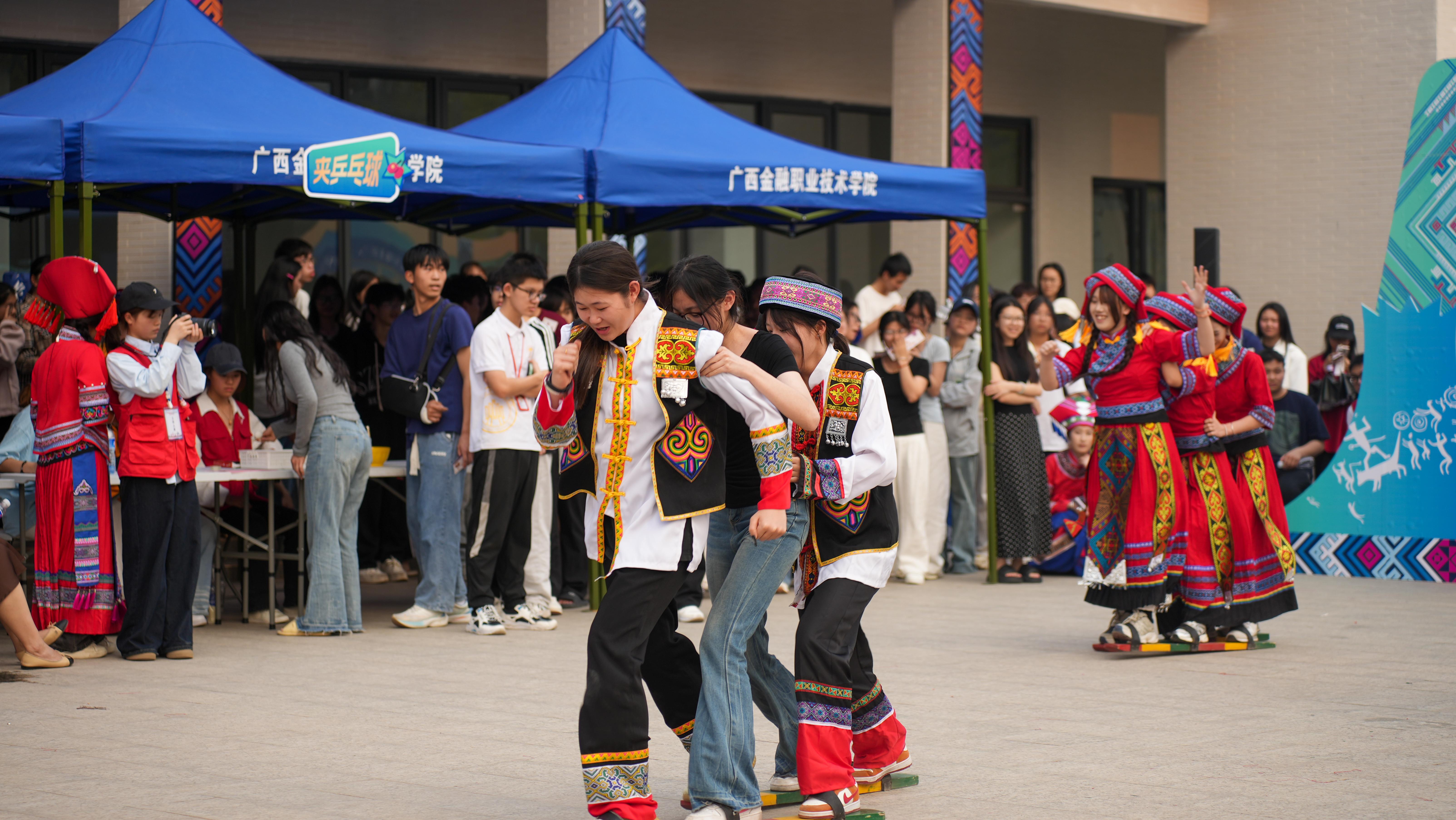 活動現場,“唱響三月三”對歌、竹竿舞等節目精彩上演,背簍接繡球、板鞋競速接力、非遺美食和漆扇繪錦繡體驗等特色項目趣味橫生,以“體驗+競技”多元形式呈現中華韻味、民族風情、廣西特色與金院風采的深度融合,為校園增添了一抹亮麗的文化底色。