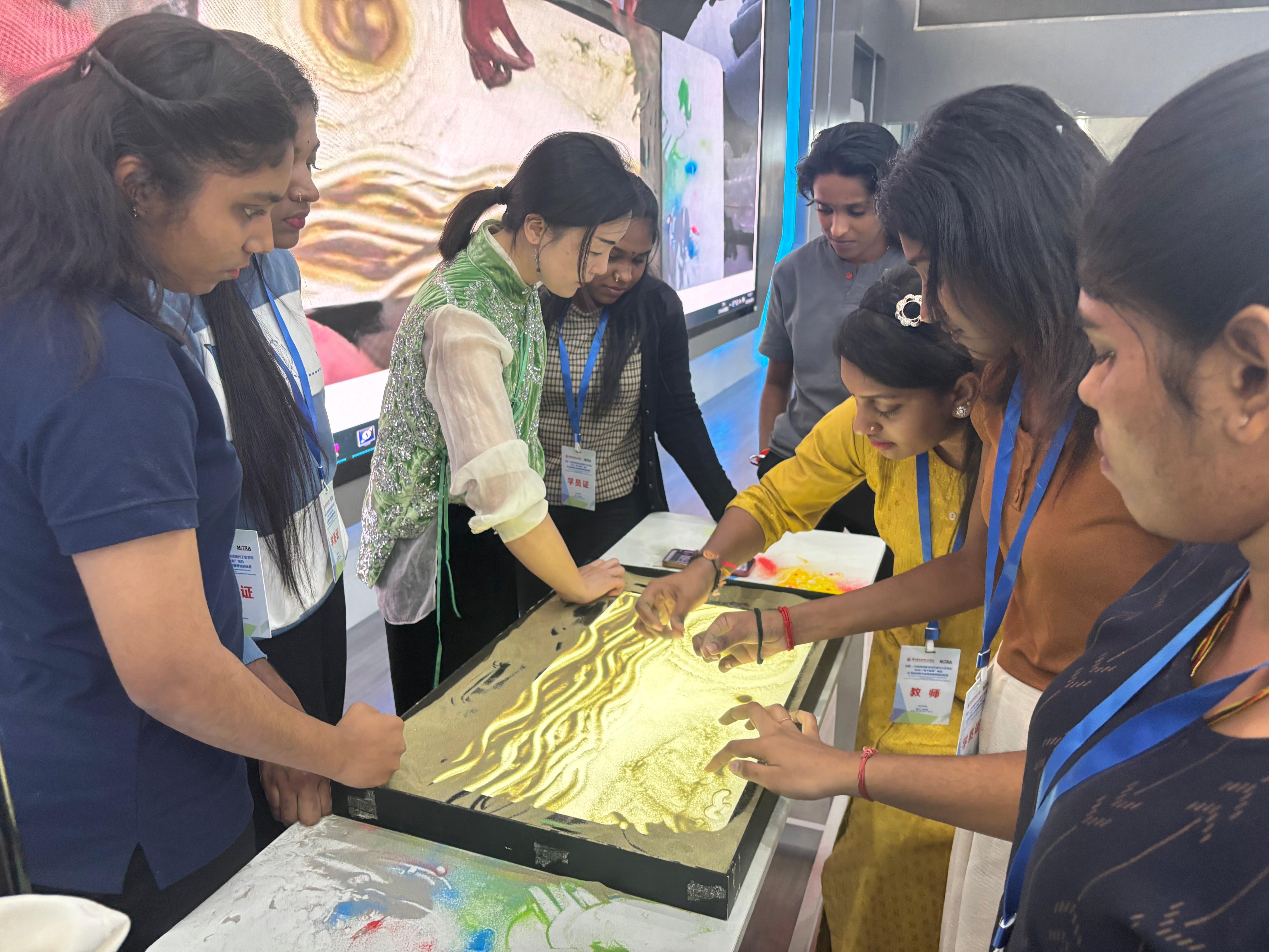 25日上午,印度社區轉型單位師生參與《沙畫藝術講座與體驗》課程。非遺傳承人通過沙畫演示講解藝術脈絡,融入壯錦、漓江、銅鼓等廣西元素,展現八桂文化。學生執沙創作,通過沉浸體驗理解中國文化與廣西歷史。