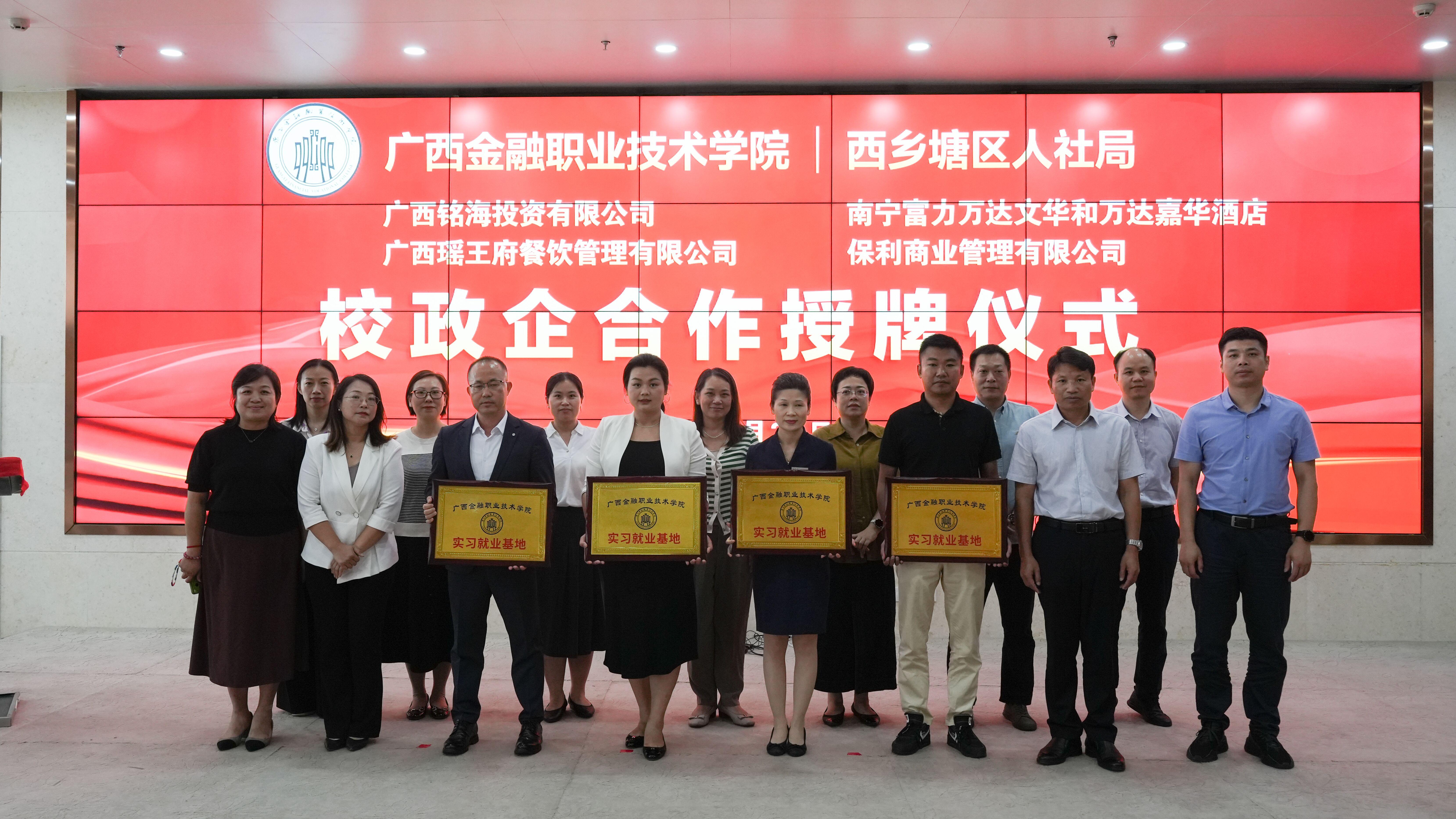 會上,劉華政副書記與蘇岸芷局長還共同為廣西銘海投資有限公司、南寧富力萬達文華、南寧萬達嘉華酒店、廣西瑤王府餐飲管理有限公司和保利商業管理有限公司等5家單位授予校企合作牌匾,進一步加深了校政企合作。